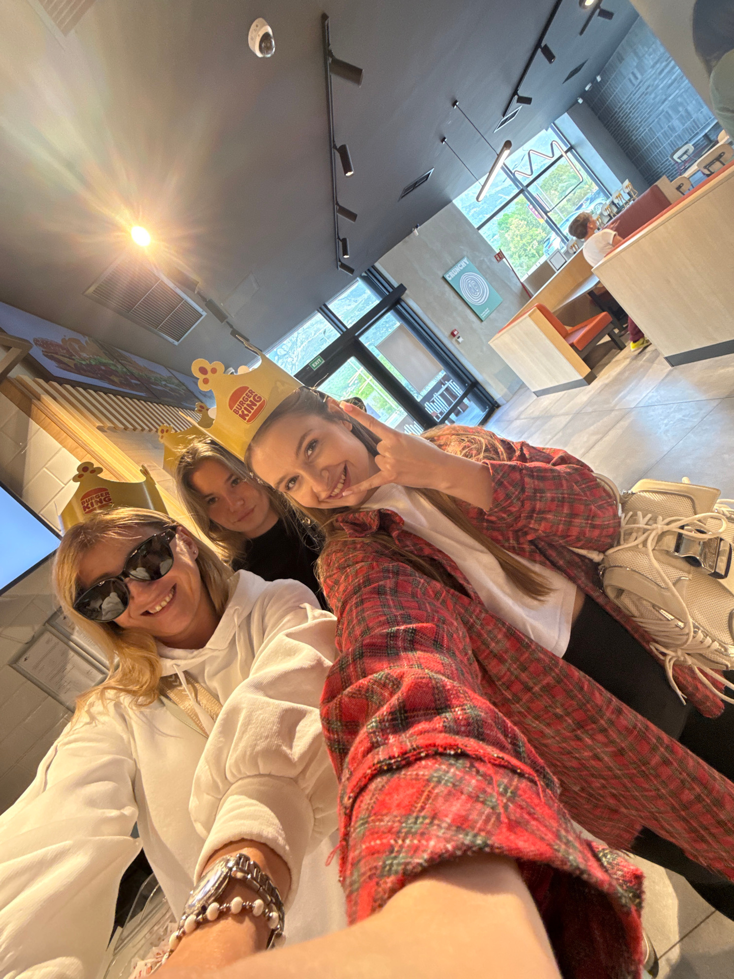 A group of three young women are taking a selfie in what appears to be a Burger King restaurant in Dub, Montenegro. All three are wearing Burger King crowns, visible with the brand's logo. One woman i…read more