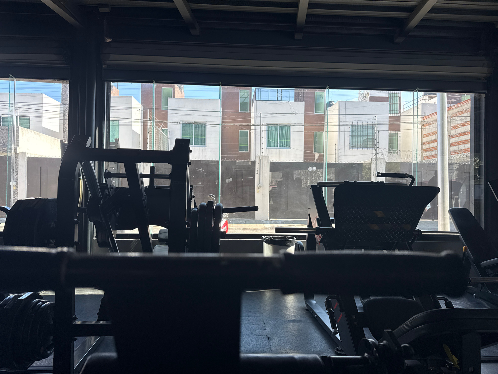 The image is taken from inside a gym located in Puebla, Mexico, with a large window offering a view of the street and buildings opposite. Gym equipment is silhouetted in the foreground, including leg…read more