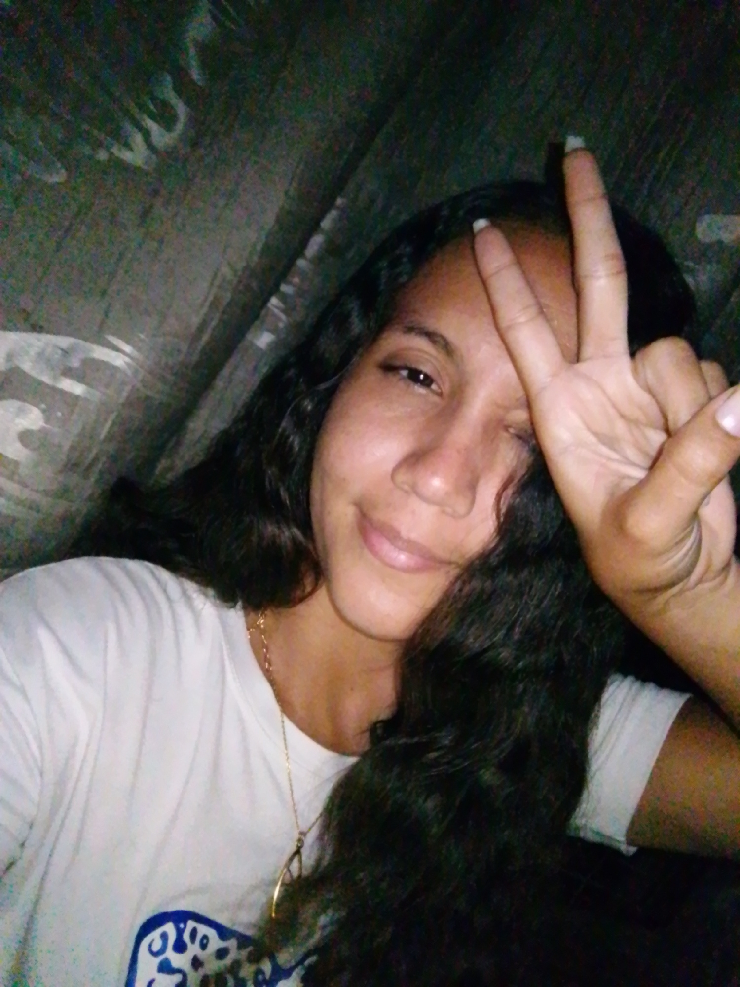 A woman is posing indoors, smiling and giving the peace sign. She has long, dark, wavy hair and is wearing a white t-shirt and a gold necklace. The background appears to be some type of textured wall…read more