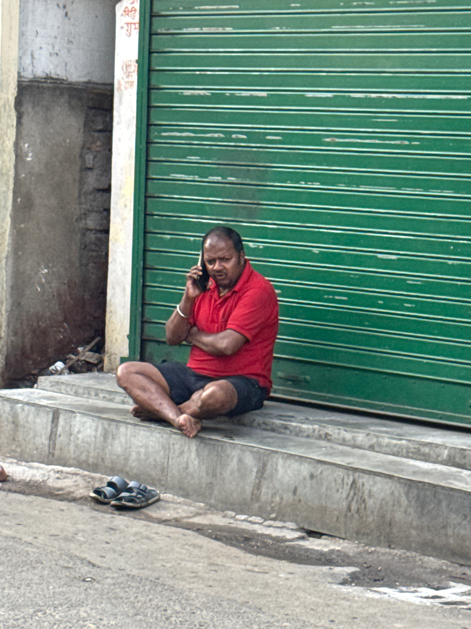 A man wearing a red shirt and dark shorts sits barefoot on a concrete ledge next to a closed green corrugated metal door. He is holding a cell phone to his ear, seemingly engaged in a call. His discar…read more