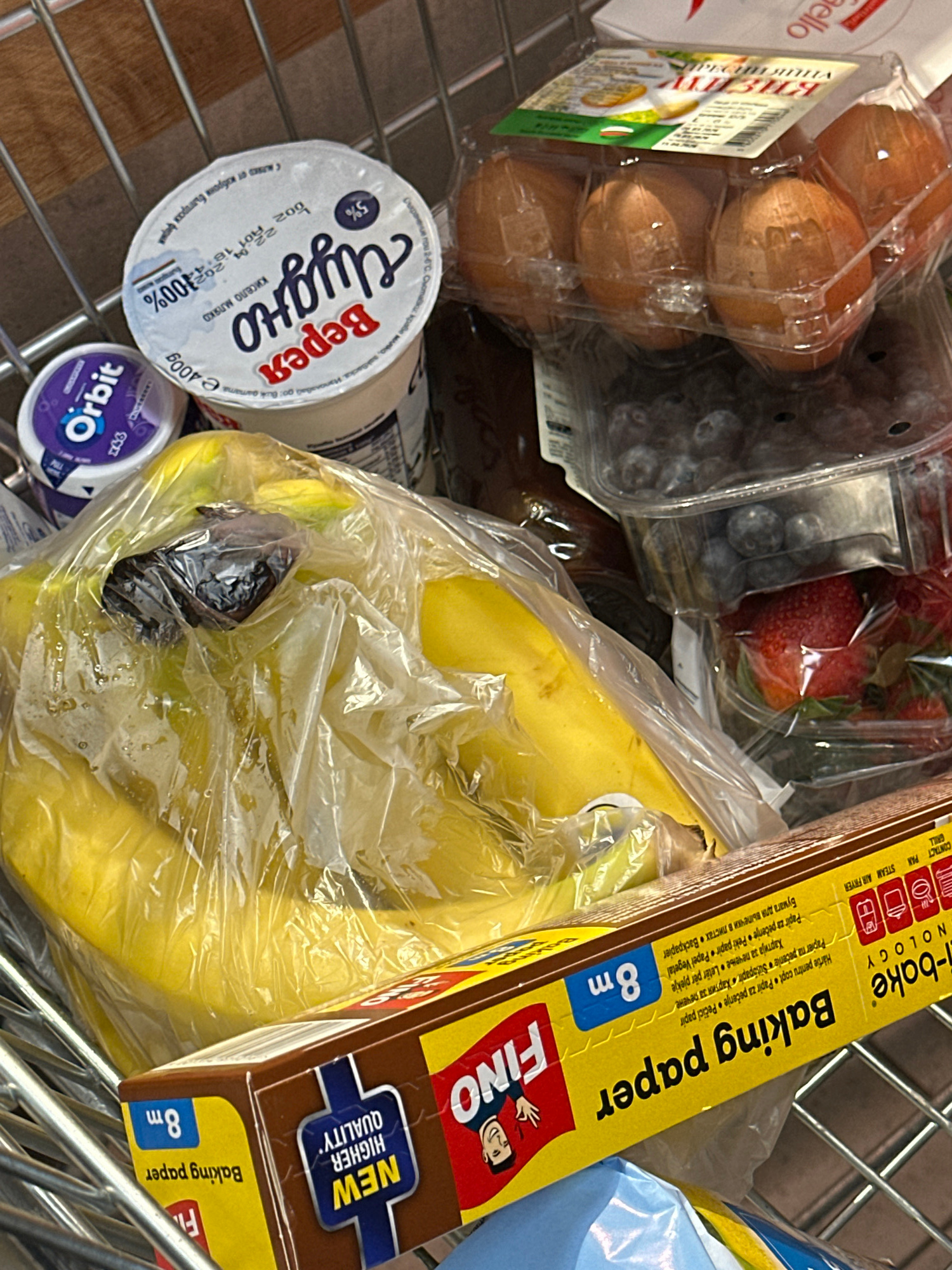 The image shows a shopping cart containing various food items. The food items include: a package of eggs, a container of blueberries, a container of strawberries, a package of bananas with a dark spot/damaged banana, a container of yogurt ("Верея Чудно") with text in Bulgarian, and a package of "Orbit" gum. There is also a roll of "Fino" baking paper. The cart appears to be located in a grocery store or supermarket, implied by the items purchased. There are no people visible. Given the presence of Bulgarian text on the yogurt and the gum, this image was likely taken in Bulgaria. Without other location clues within the image, it is not possible to determine if it was specifically taken in Varna. | Open Wire