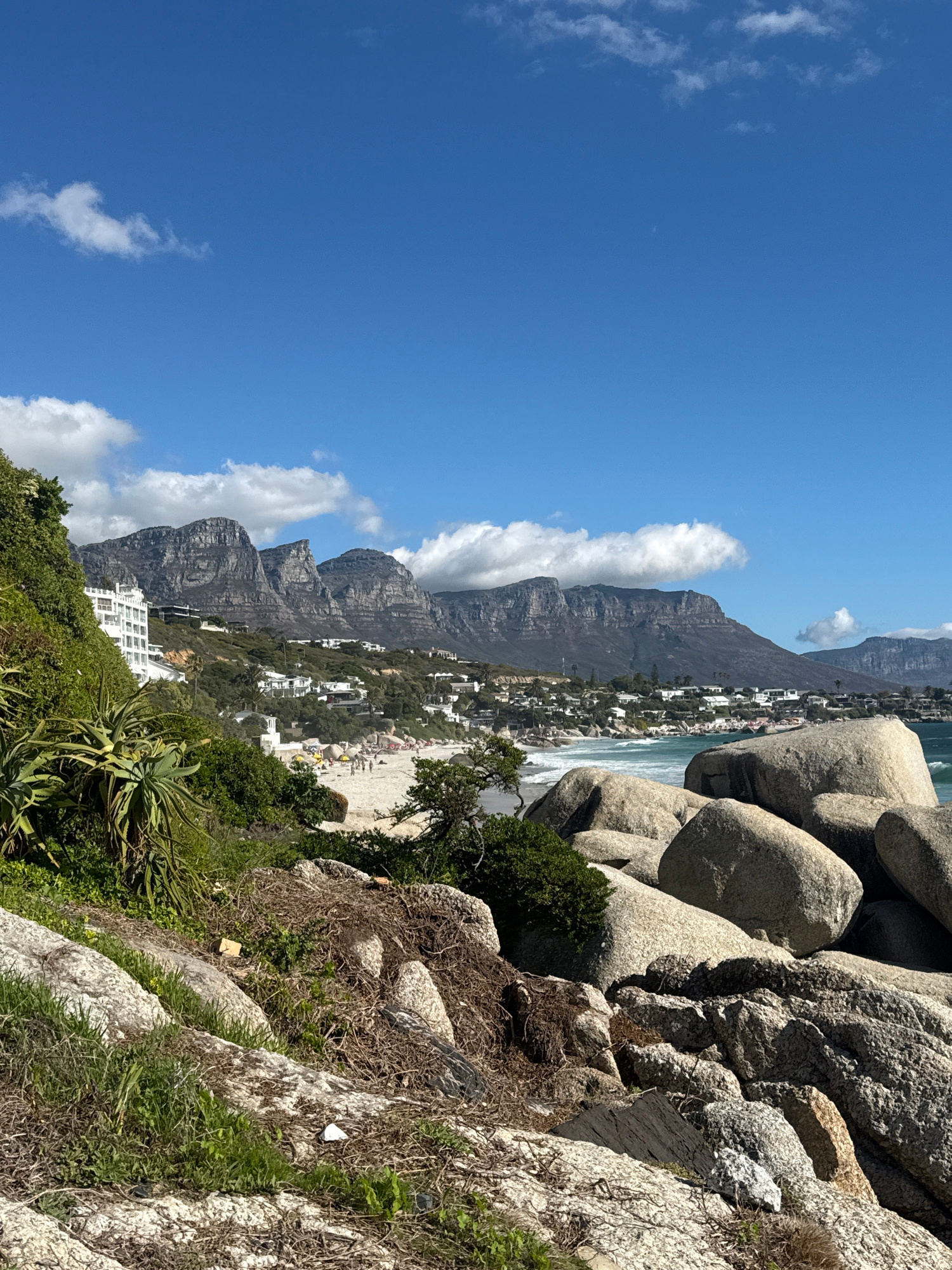 The image shows a view of Camps Bay in Cape Town, South Africa, taken from an elevated vantage point, possibly on a rocky outcrop. Dominating the left side of the frame is the iconic Table Mountain ra…read more