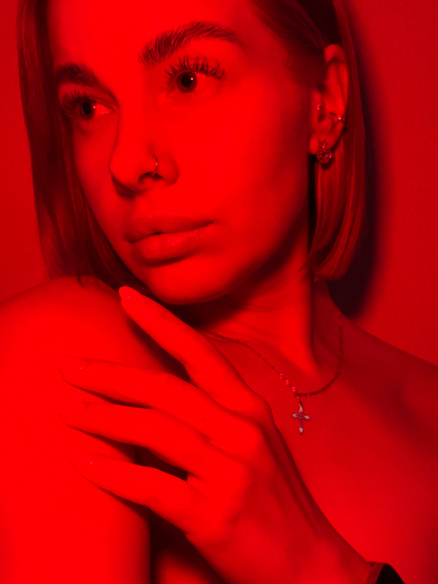 This close-up, angled shot features a young woman reclined, illuminated by intense red lighting. Her face, positioned towards the viewer, is the central focus, showcasing her defined eyebrows and long…read more