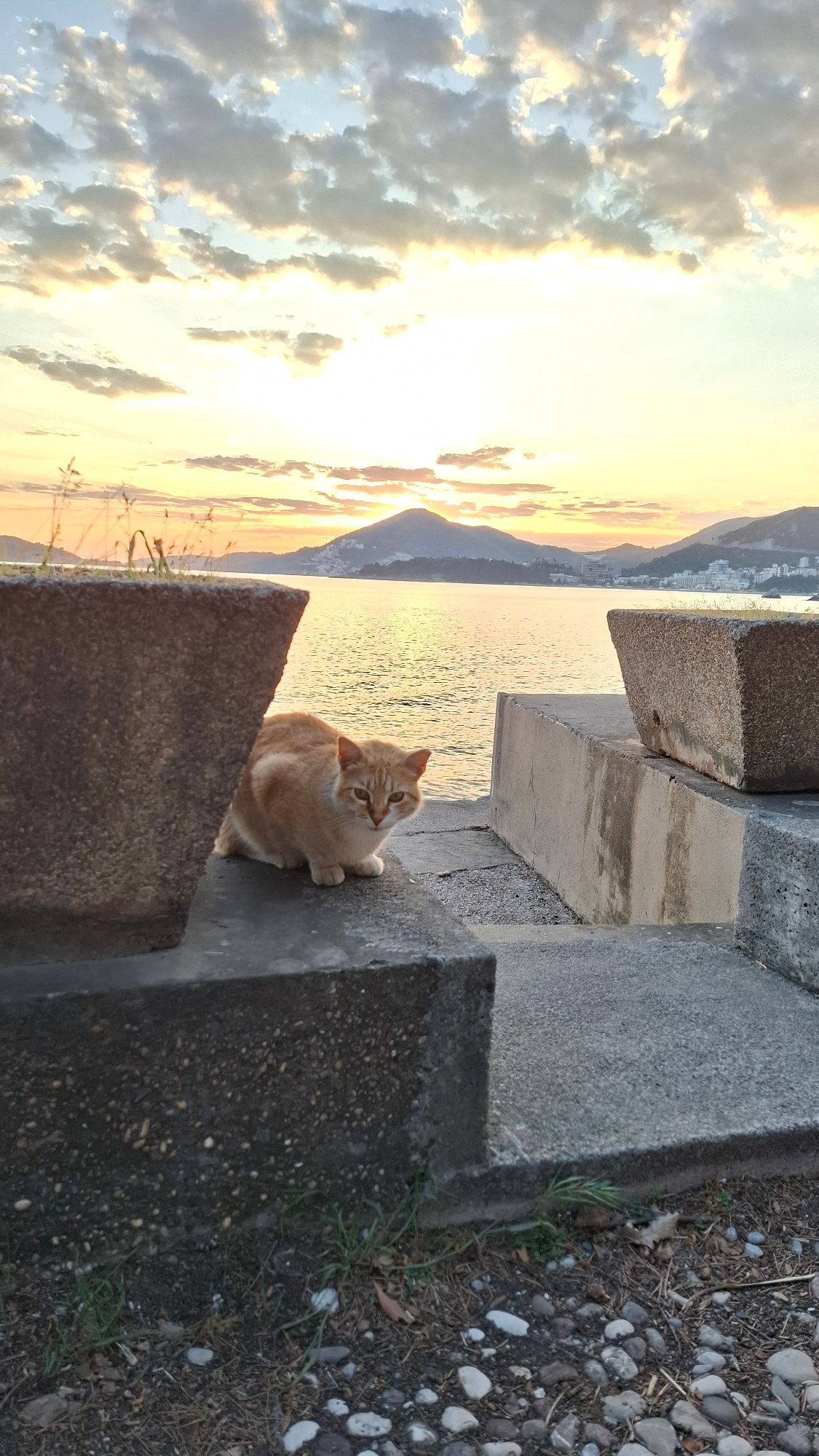 A ginger tabby cat sits on a concrete ledge next to a body of water. The location appears to be a walkway or embankment overlooking the water. In the background is a mountain range and a vibrant sunse…read more