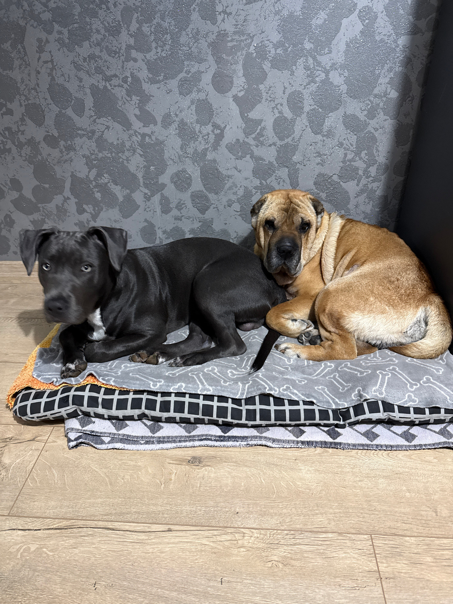 Two dogs are lying in a dog bed placed in the corner of a room. The dog bed is positioned against a dark gray wall and adjacent to a light brown wooden floor. The top dog is a tan color with wrinkles…read more