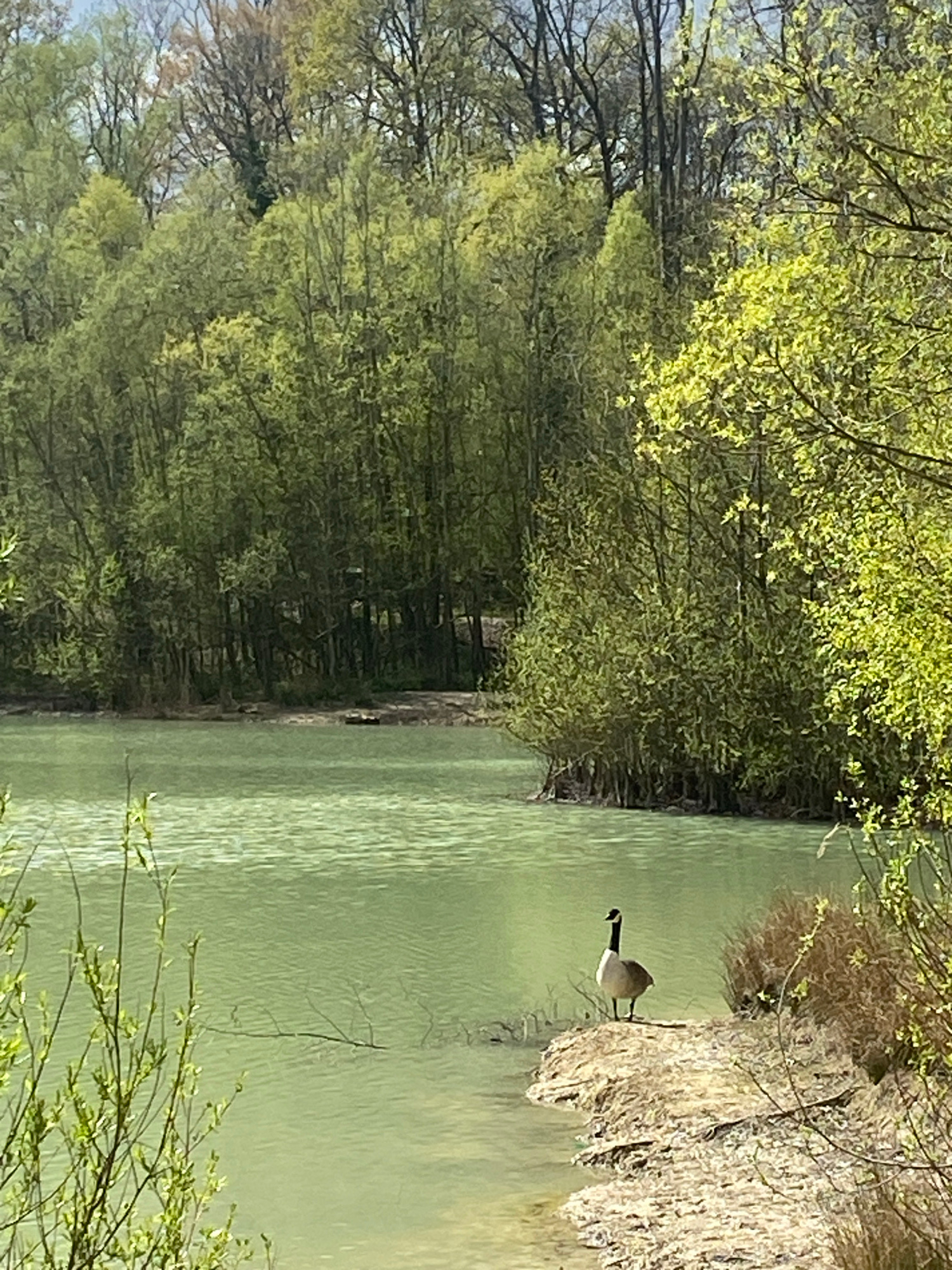 A goose stands on the bank of a body of water surrounded by lush green trees. The location is Saint-Martin-du-Tertre, France.