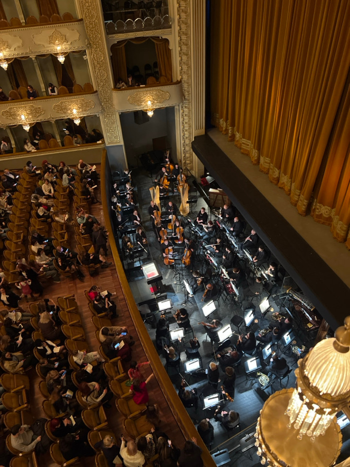 An orchestra performs on a stage viewed from above. The orchestra members are seated and playing instruments. A large chandelier hangs above them. An audience is seated in rows of chairs, many looking…read more