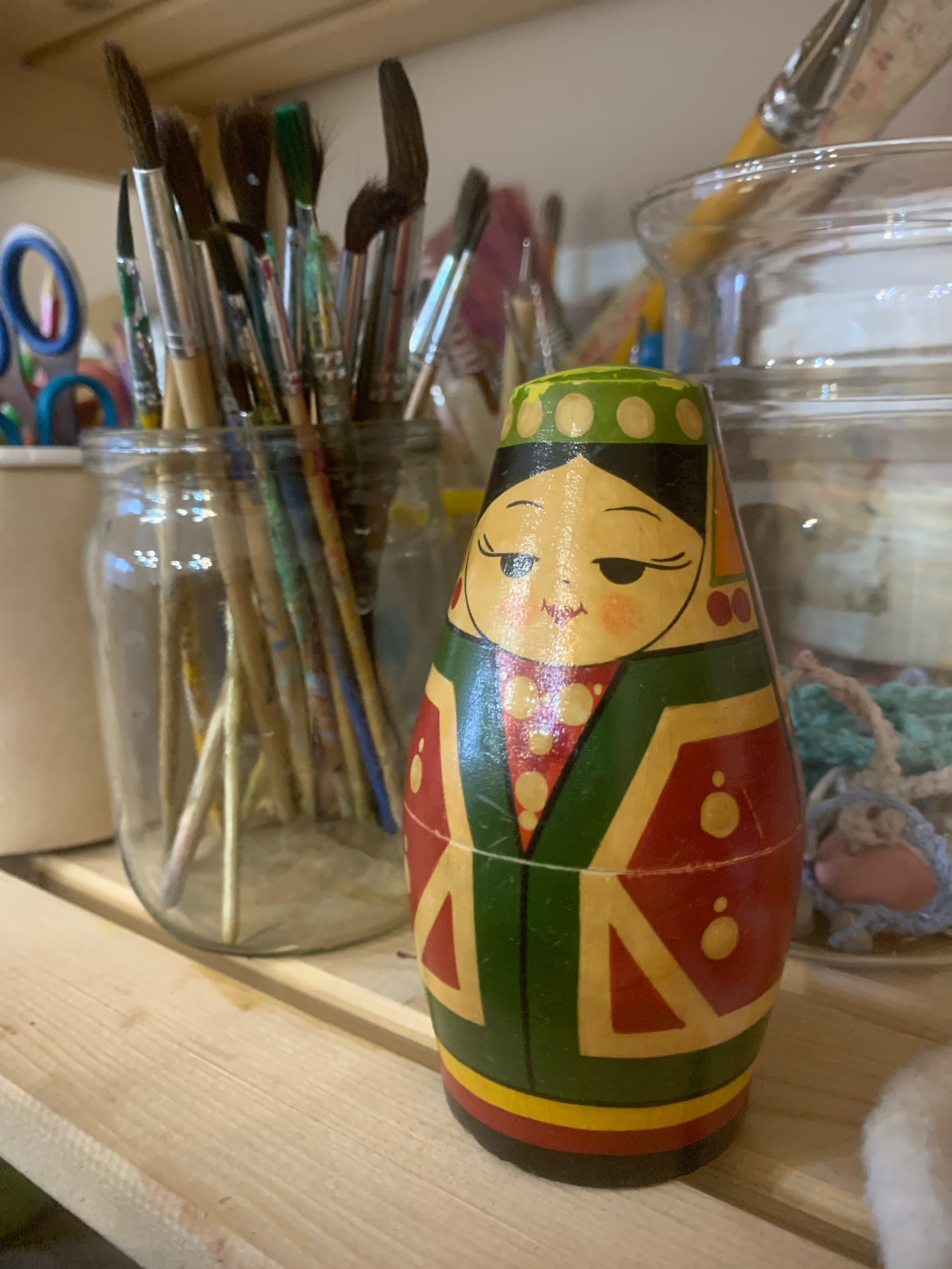 The image shows a close-up of crafting supplies on a wooden shelf. A painted wooden Matryoshka doll, with a woman's face depicted on it, lies horizontally. A jar filled with paintbrushes is also visib…read more