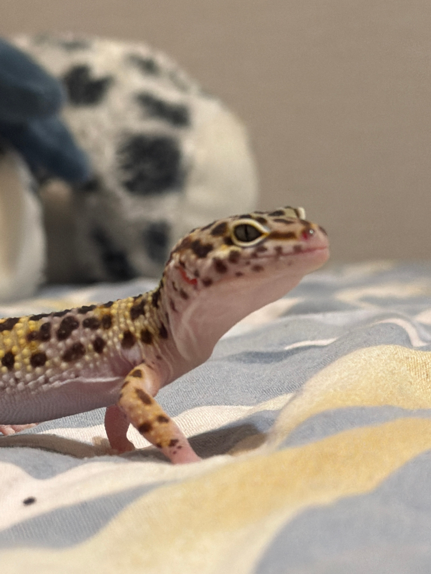 A leopard gecko clings to a striped surface. The gecko's head is in focus, showing its eye and the pattern of spots. The body of the gecko extends downwards, also displaying a spotted pattern. In the…read more