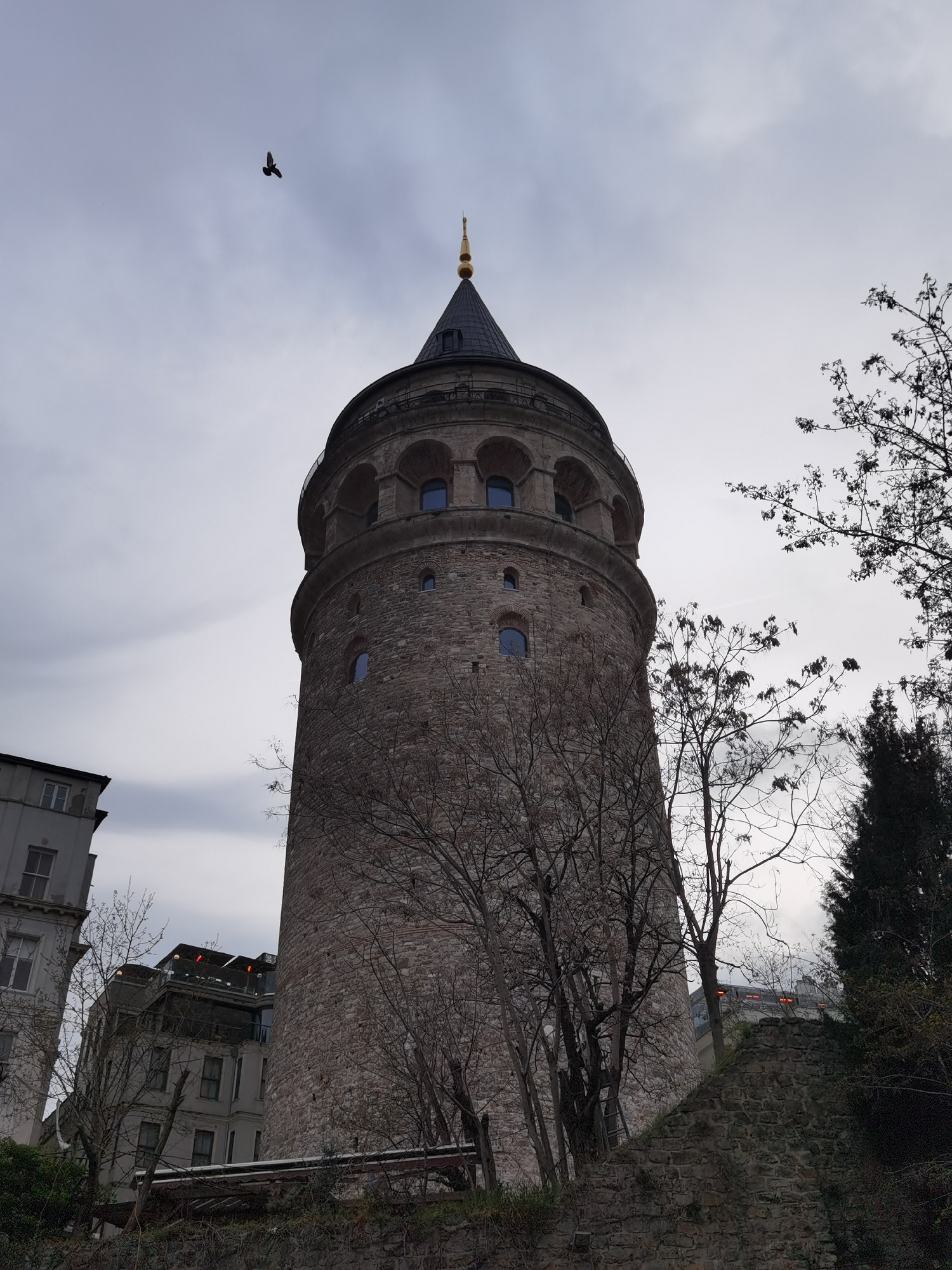 The scene is set in Beyoğlu, Turkey, featuring the iconic Galata Tower captured from a low-angle perspective, looking upwards against an overcast sky. The prominent subject is the tall, cylindrical s…read more