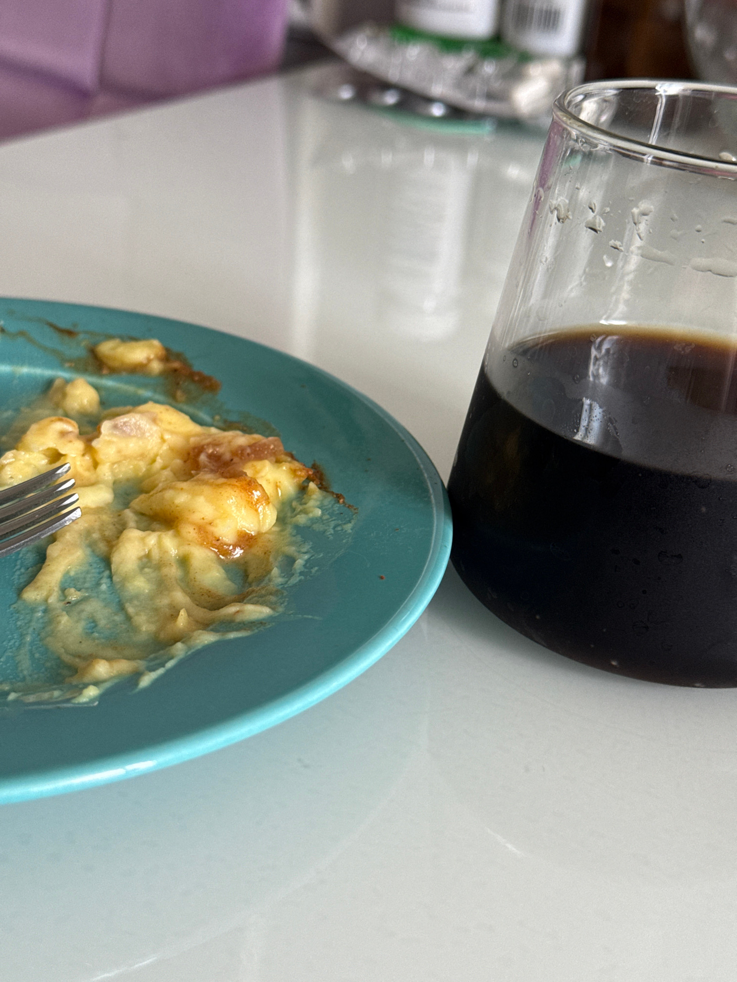 The image shows a partially consumed meal on a light blue plate with a fork. The meal appears to be scrambled eggs with some sort of topping, possibly syrup or sauce. Above the plate is a glass contai…read more