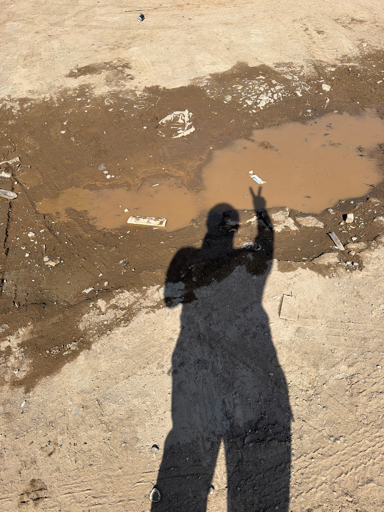An overhead, high-angle shot captures a sunlit, muddy ground scene in Chaikovsky, Russia. The terrain features a large, irregularly shaped puddle of murky brown water surrounded by dark-brown wet mud,…read more