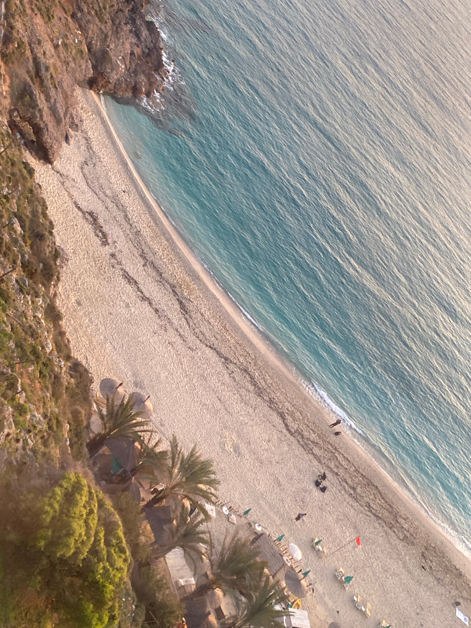 The image presents an aerial view of a beach in Alanya, Turkey. The scene includes the Mediterranean Sea, a sandy beach, coastal vegetation, and rocky terrain. The sea occupies the upper left portion…read more