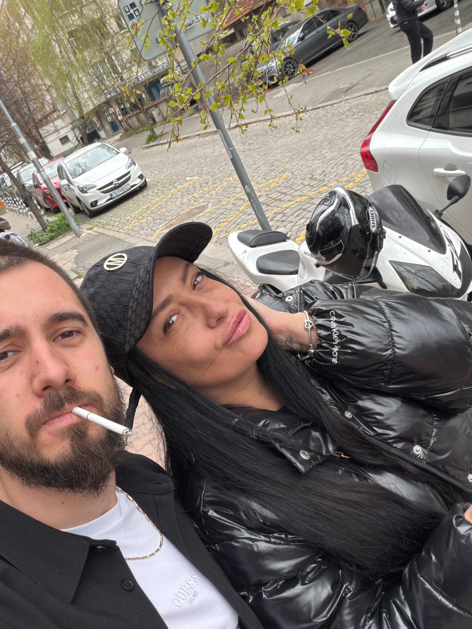 A street scene in Sofia, Bulgaria. Two people, a woman and a man, are posing for a photograph. The woman is wearing a shiny black puffer jacket with a "Calvin Klein Jeans" logo visible, and a black ba…read more