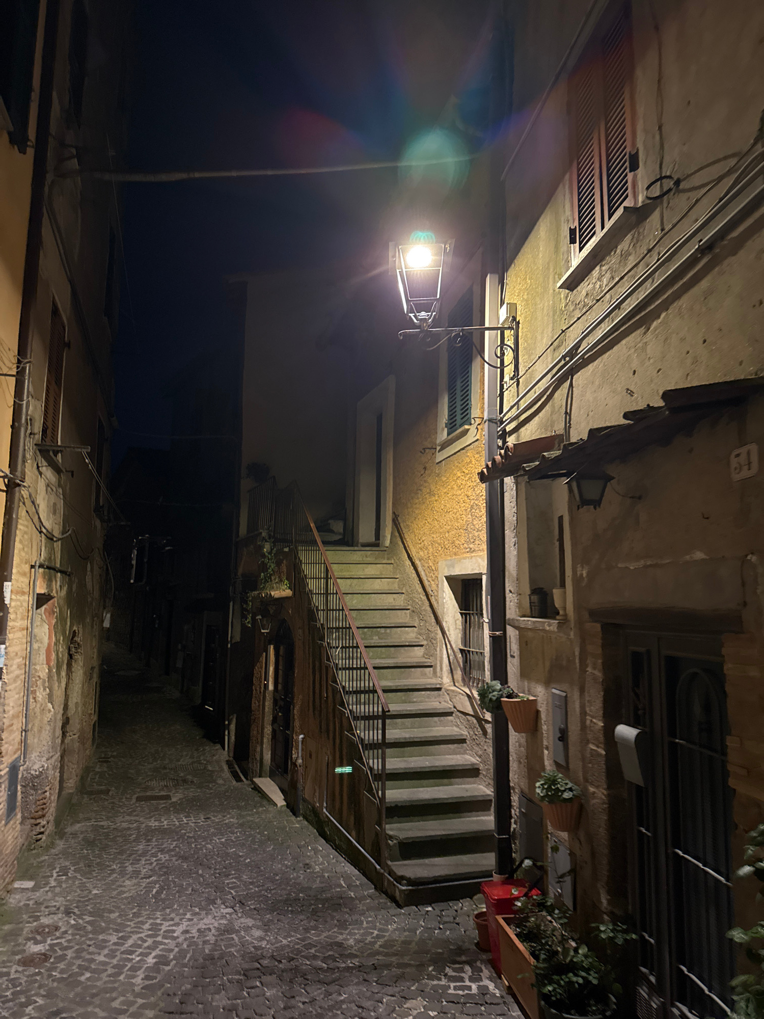 Captured at night, the scene depicts an alleyway in Castelnuovo di Porto, Italy. The alley is enclosed by buildings on both sides, constructed with aged stone and concrete materials, with visible util…read more