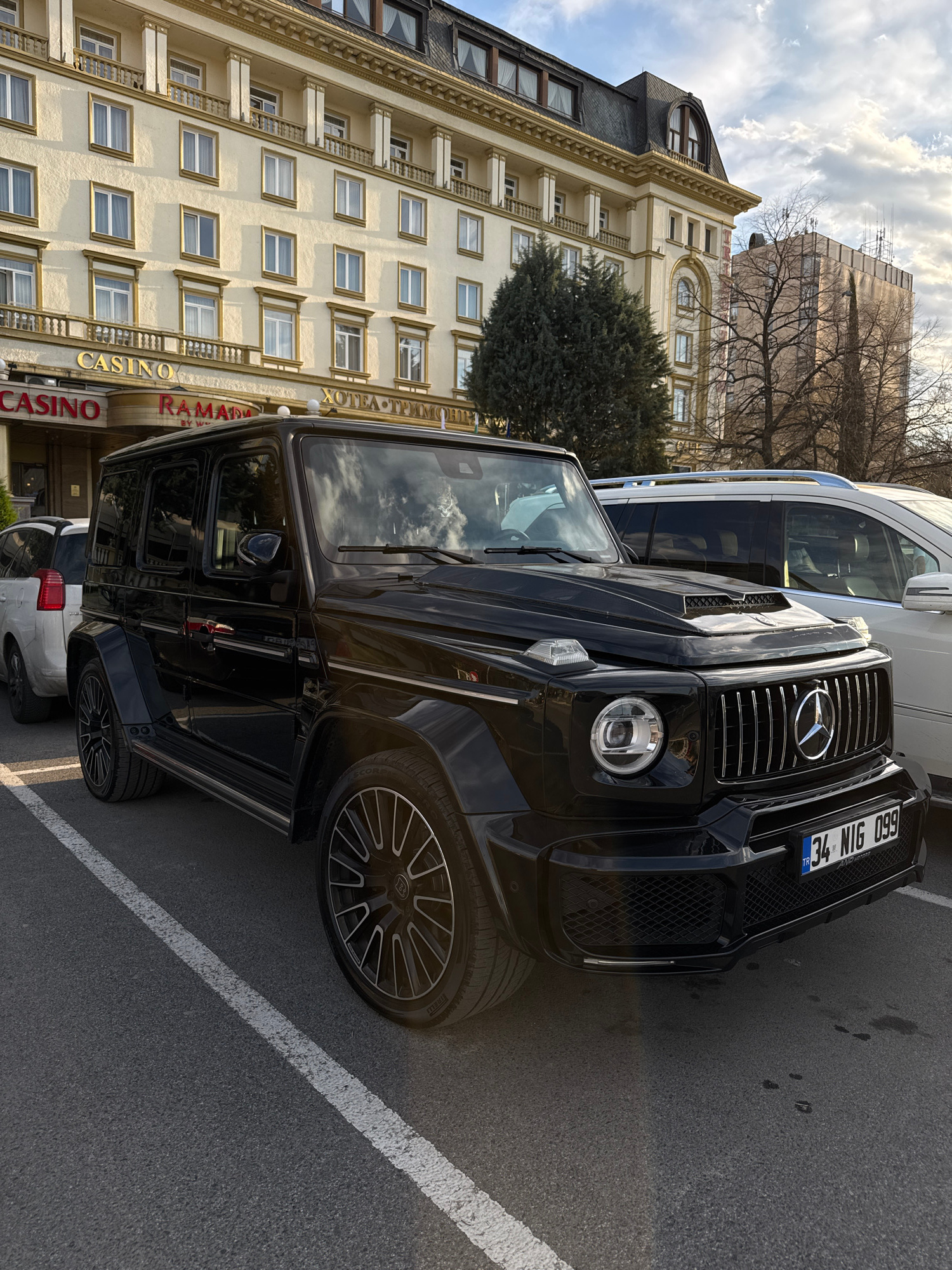 The image shows a black Mercedes-Benz G-Class parked on a street in Plovdiv, Bulgaria, in front of the Ramada by Wyndham Plovdiv Trimontium Casino. The car is parked parallel to the curb, next to a wh…read more