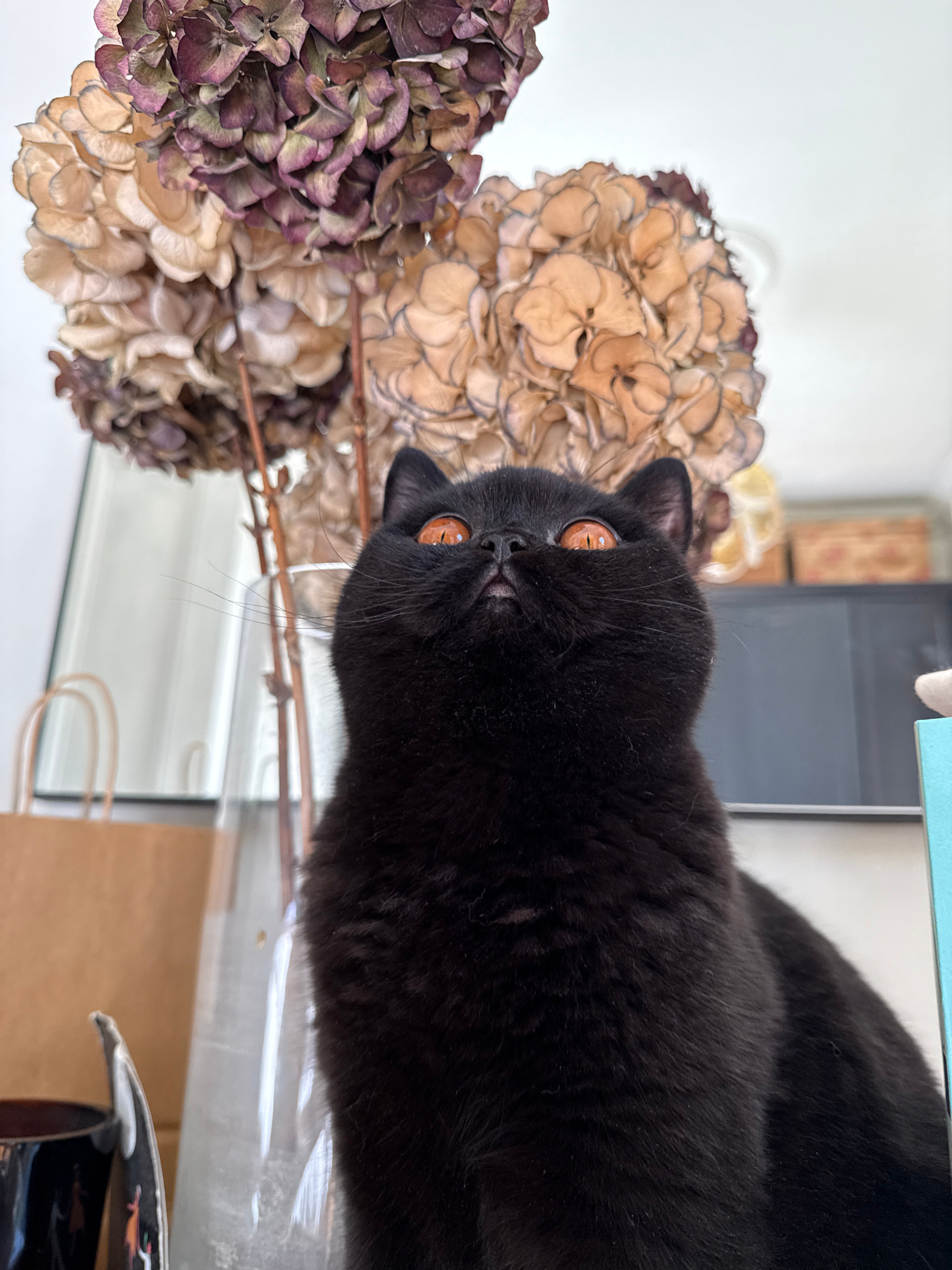 A dark-furred cat with amber eyes is positioned near dried hydrangeas. The hydrangeas are arranged in two clusters, one in hues of beige and light brown, and the other in shades of purple and brown. T…read more