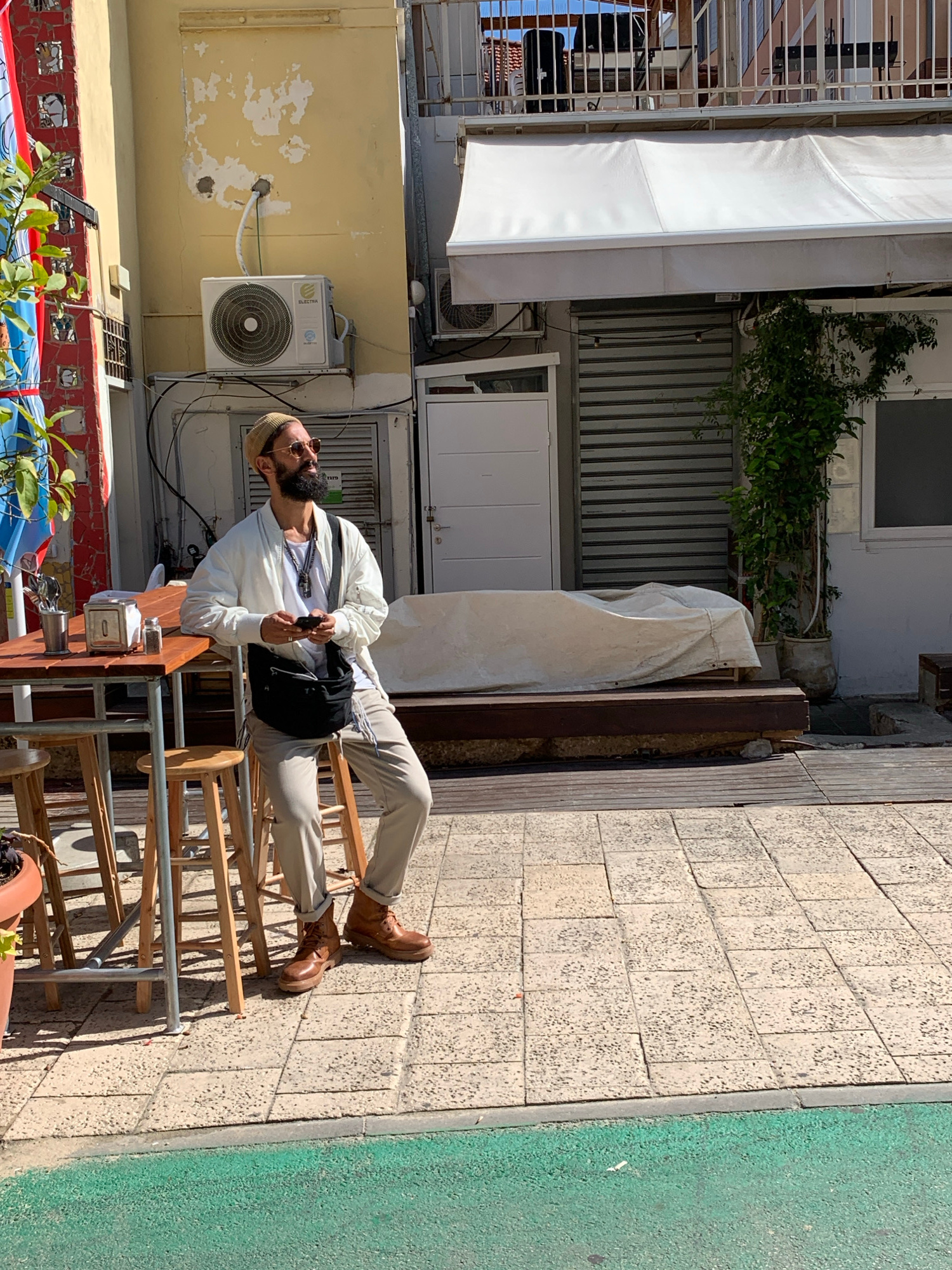 A man stands on a set of wooden steps on a tiled sidewalk next to a green painted surface. The man has a beard and is wearing a white jacket, light-colored pants, and brown boots. He is holding a mobi…read more