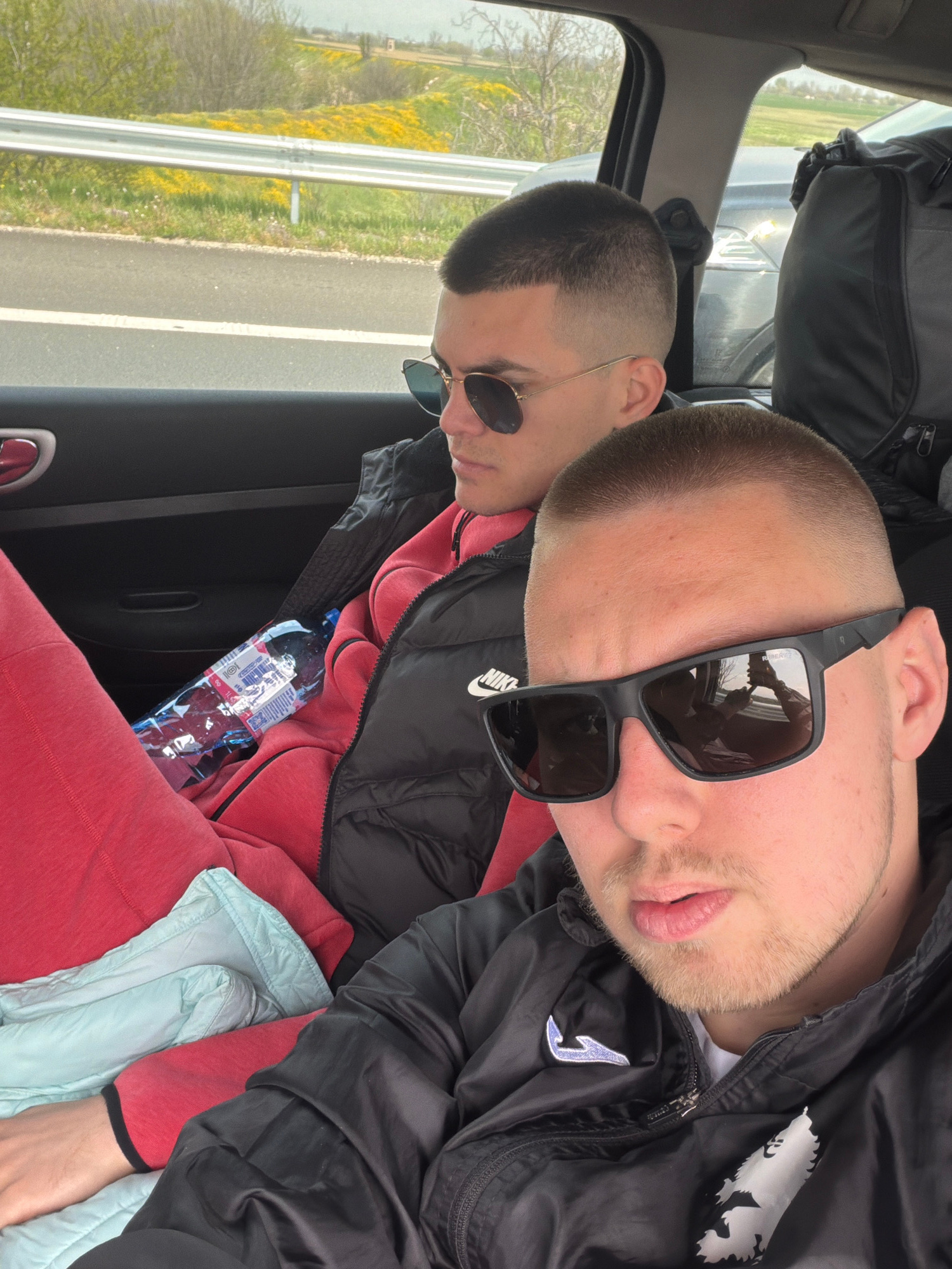 The image shows two young men in a car, presumably traveling. One man is closer to the camera and wearing sunglasses, a black jacket, and a red hoodie. The other man, seated in the background, is also…read more
