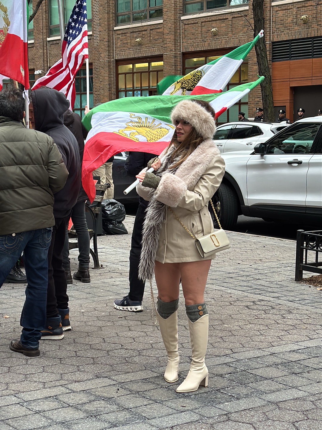 This image captures an outdoor gathering on a paved city street in New York, United States. A female individual stands centrally, facing forward and slightly to her left. She wears a beige, long-slee…read more