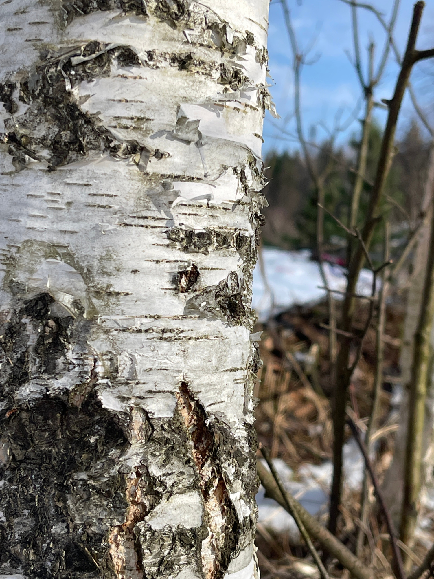 A close-up photograph captures a section of birch tree bark in stark detail. The bark's surface exhibits the characteristic white and black markings, with peeling sections and areas of rough texture. In the background, out-of-focus branches and a hint of sky are visible. The image was taken in Zhigalki, Russia. | Open Wire