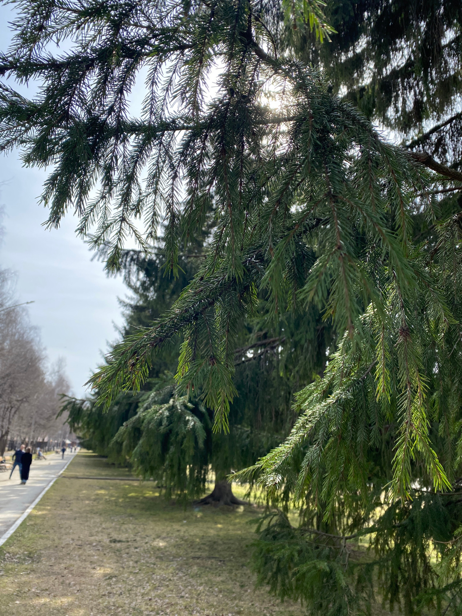 The image is taken from below a tree, looking up into its branches and needles. The sun shines through the leaves, creating bright spots. In the background, a path stretches into the distance, lined w…read more