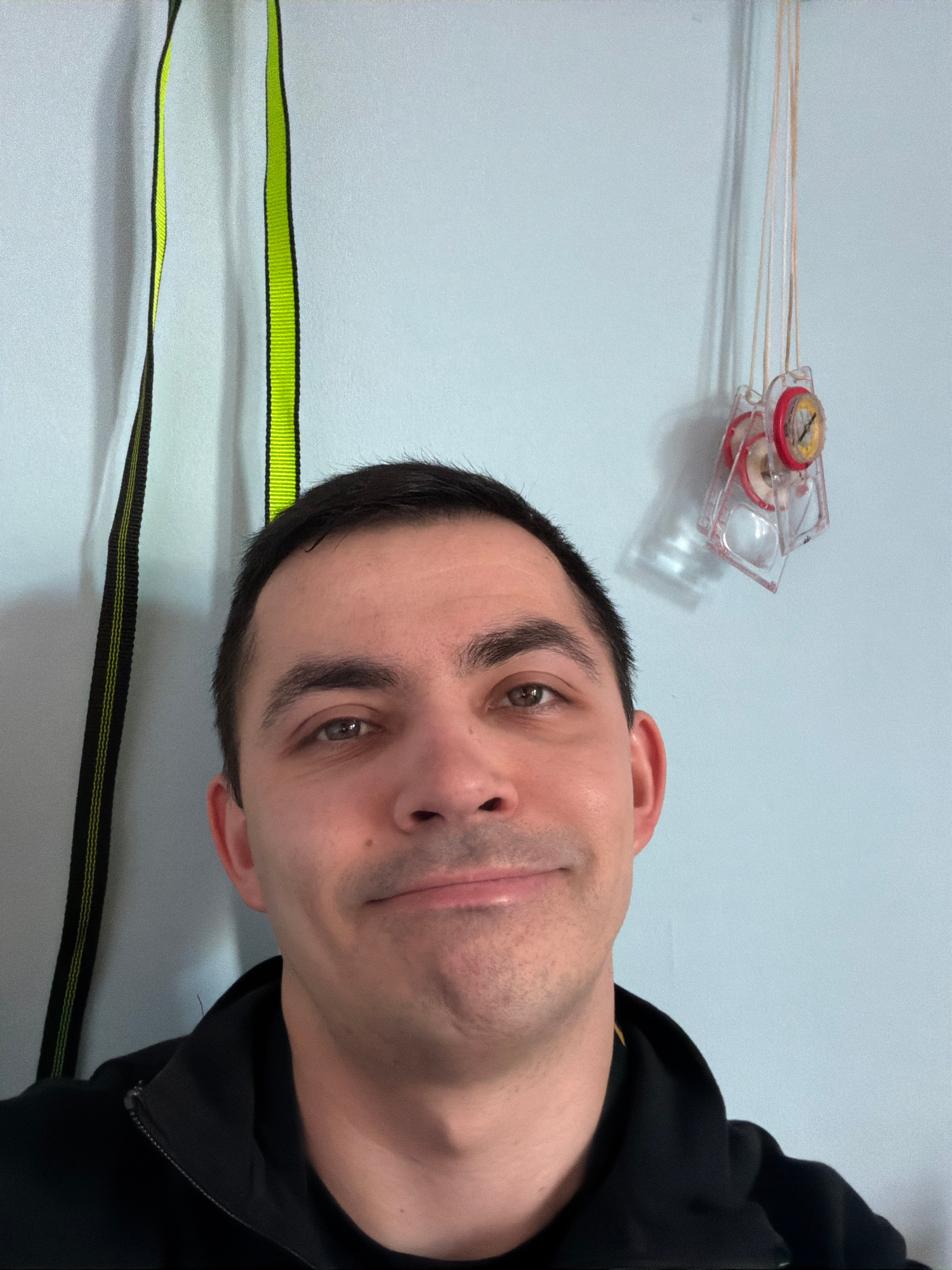 A selfie taken by a man with short, dark hair and brown eyes. He is wearing a black hoodie. In the top left corner of the image is a small, clear plastic device with red and white components and thinβ¦read more