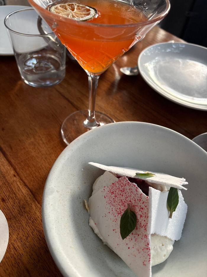 An overhead shot captures a dining table scene. On the right, a light gray bowl cradles a dessert with white meringue shards, dollops of cream, red sprinkles, and green leaves. To the left, a tilted m…read more