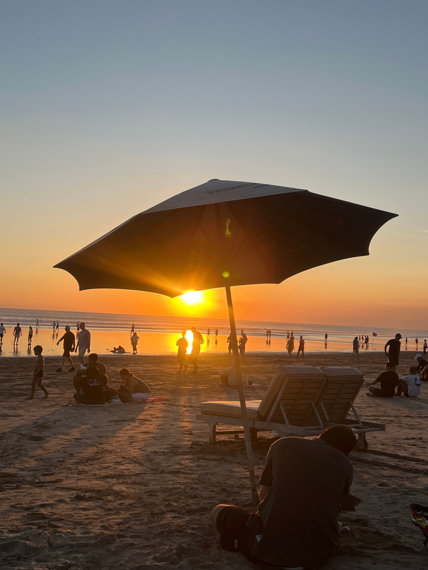 This photograph captures a vibrant sunset scene on a crowded beach in Kuta, Indonesia. The sun, a brilliant orange-yellow orb, is positioned low on the horizon, creating a powerful lens flare and bathβ¦read more