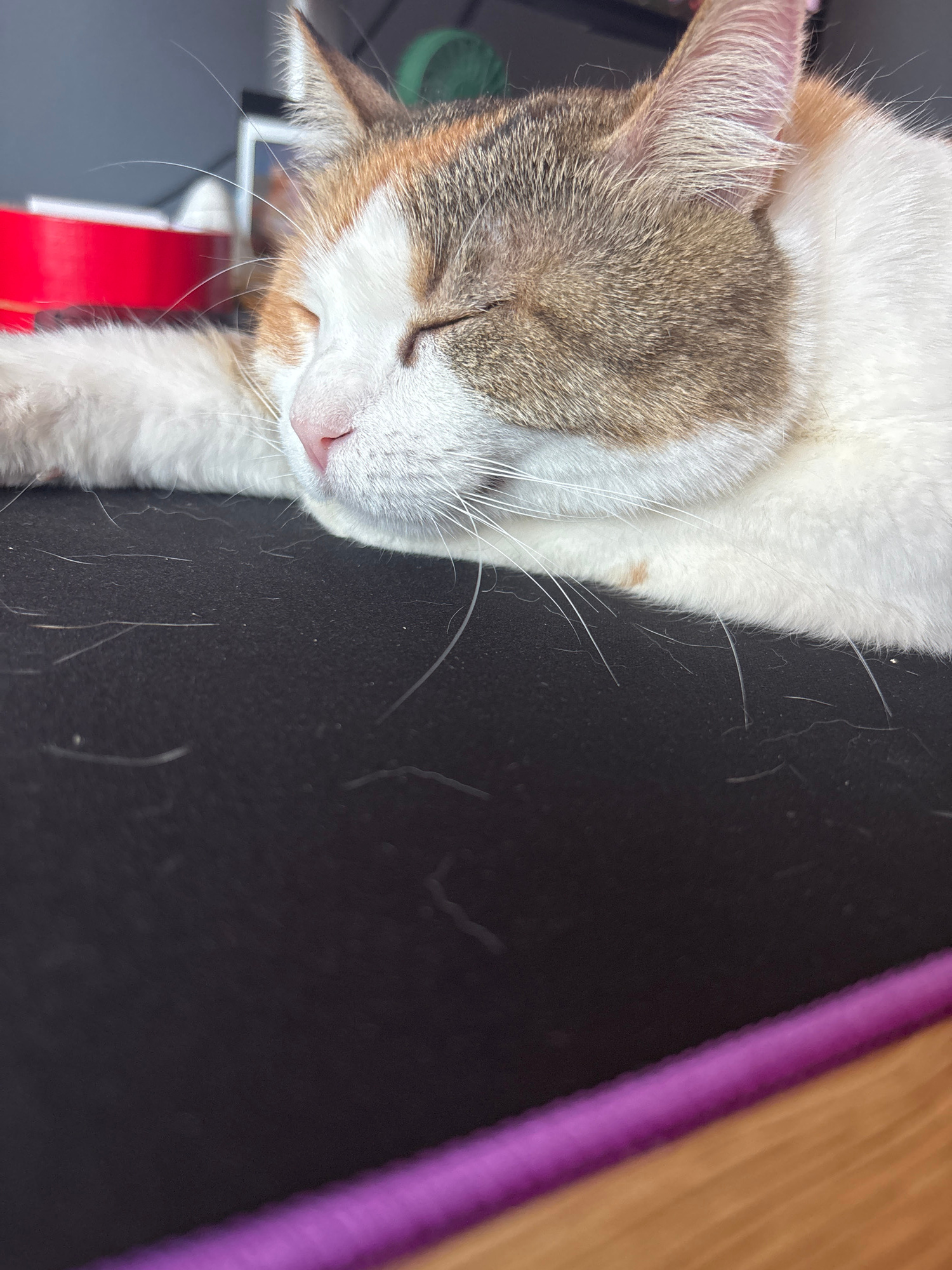 A sleeping cat is lying on a dark-colored surface. The cat has white fur with patches of brown and tan on its head and face. The cat's eyes are closed. Stray white hairs are visible on the dark surfac…read more