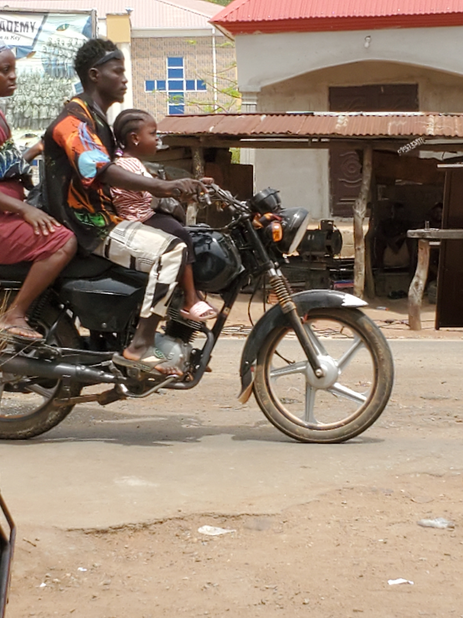 A medium shot captures a group of people on a motorcycle in Mararaba, Nigeria. Three individuals are visible: the rider, a young man with a black headband and colorful shirt, sits at the front. Behind…read more