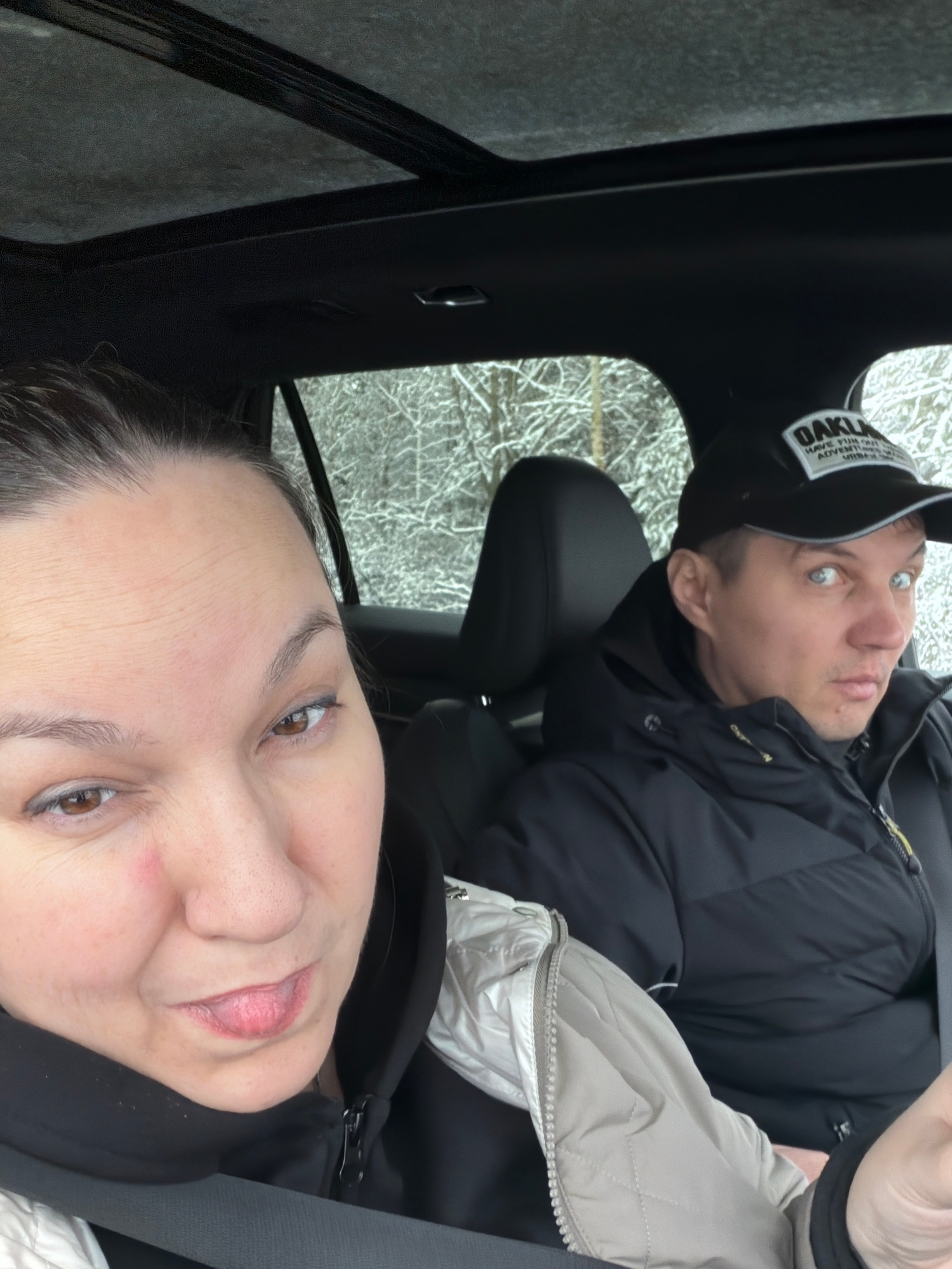 The image shows two people inside a car. A woman is in the foreground, taking a selfie. Behind her is a man wearing a black jacket and a black baseball cap with white lettering. The car's interior is…read more