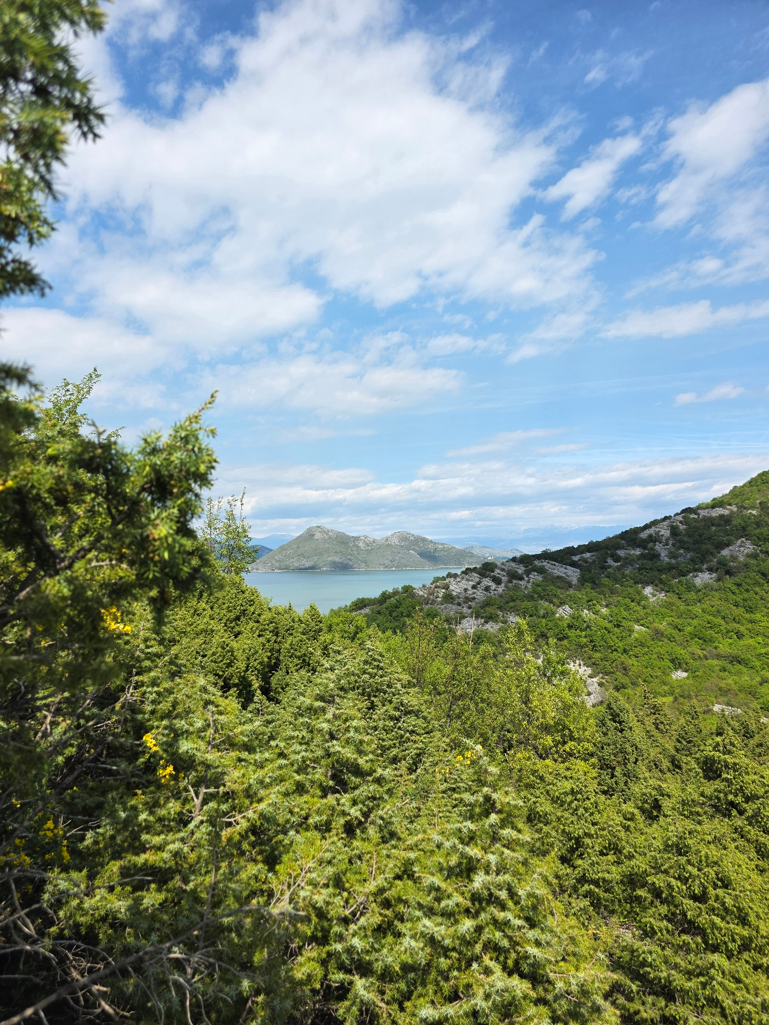The image shows a view of Lake Skadar from Godinje, Montenegro, under a partly cloudy sky. The perspective is angled, showing lush green vegetation and trees in the foreground and on the right side of…read more