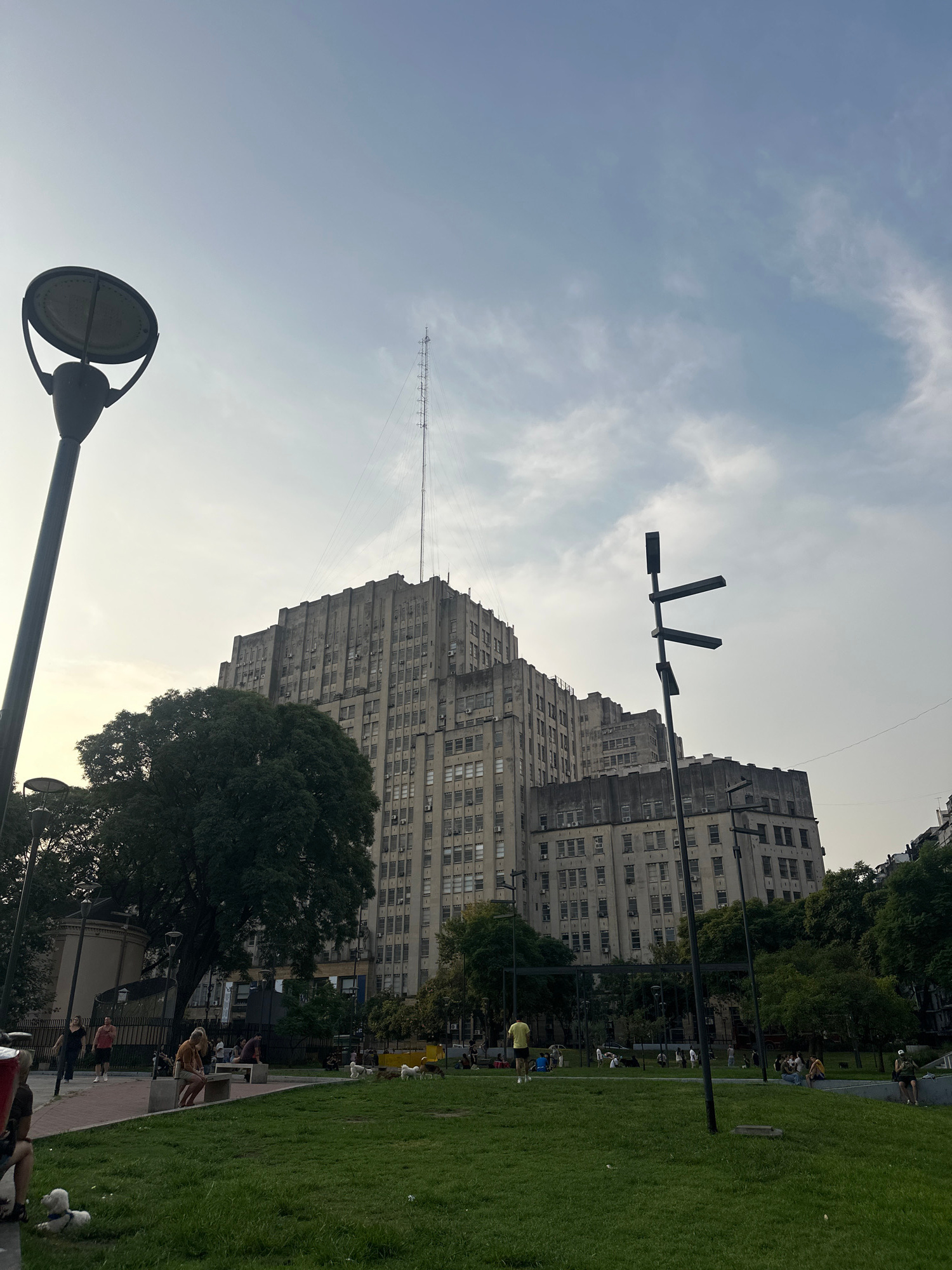 The image shows a scene in Buenos Aires, Argentina, specifically the Edificio del Ministerio de Desarrollo Social. The building is a large, multi-story structure with many windows, constructed of concβ¦read more