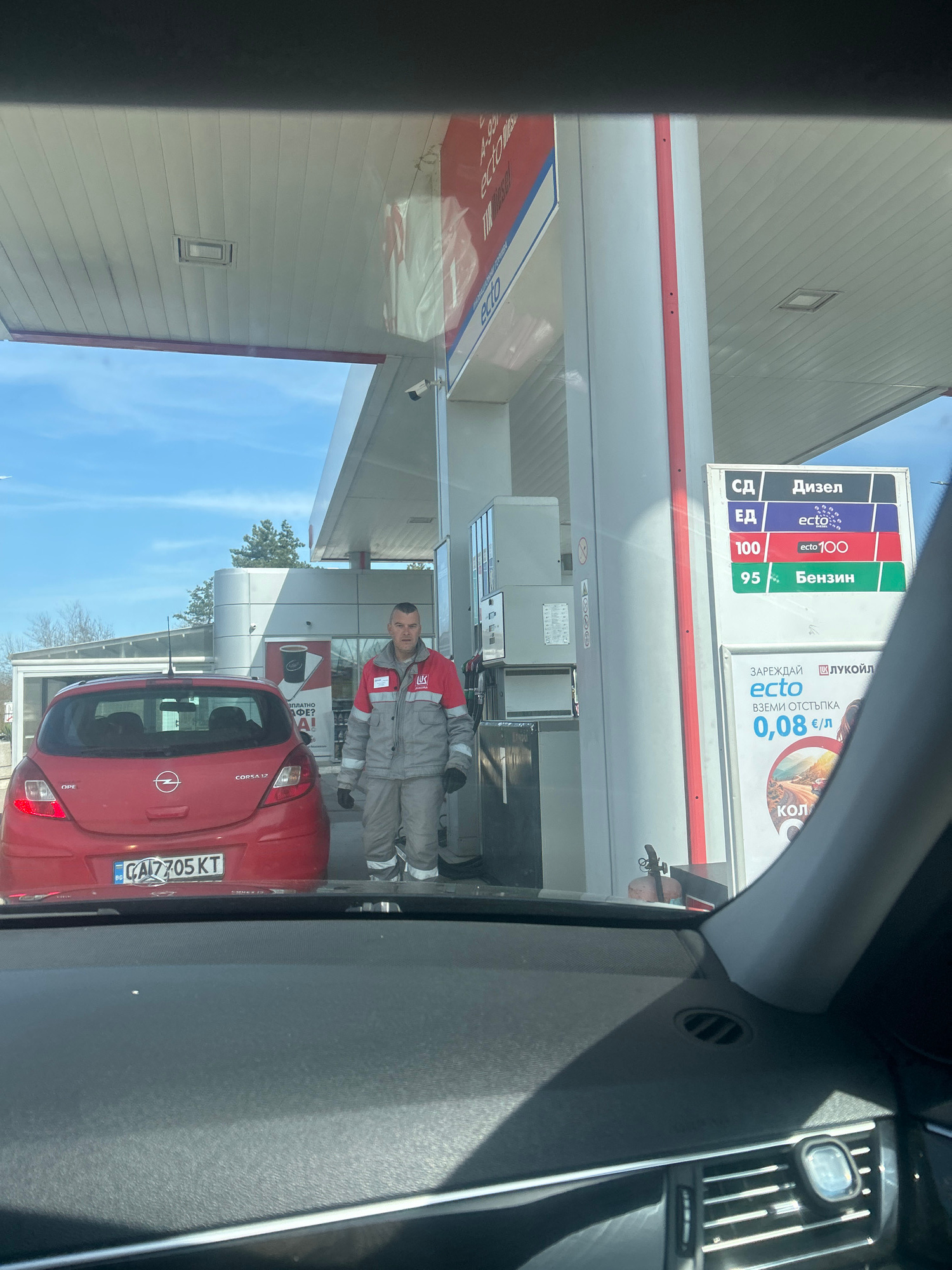 The image shows a gas station, identified by the LUKOIL brand and signage in Bulgarian Cyrillic. A red Opel Corsa with the license plate CA7705KT is parked at one of the pumps. A gas station attendant…read more