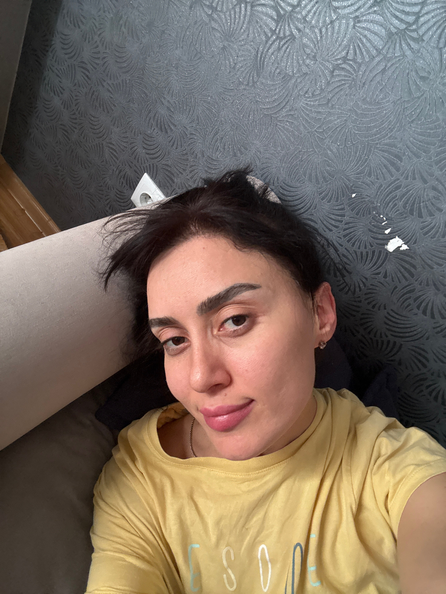The image is a selfie of a woman lying on what appears to be a sofa or bed, with a patterned wallpaper in the background. The woman has dark hair and is wearing a yellow t-shirt. The location is not a…read more