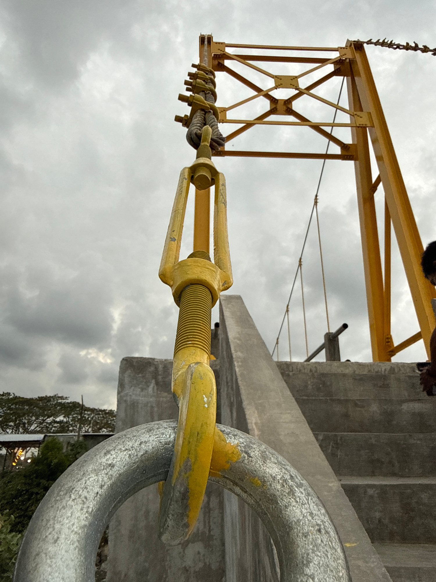 A low-angle shot shows a portion of a yellow metal construction crane with a long, yellow turnbuckle attached to a large gray metal shackle. The crane's structure features a lattice-like design with b…read more