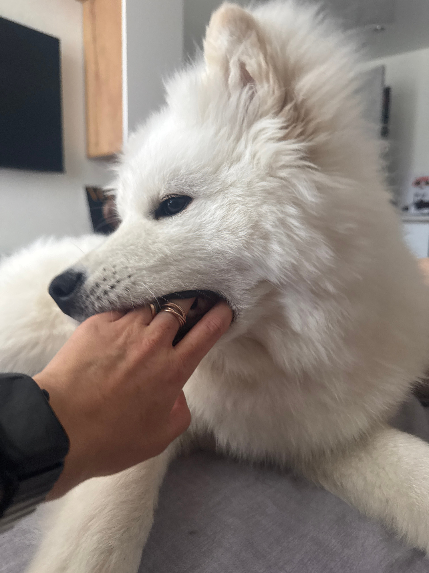A close-up, slightly angled, indoor shot shows a fluffy, white Samoyed dog being touched by a hand. The hand is in the lower right quadrant of the image, with several thin gold rings on the fingers. T…read more