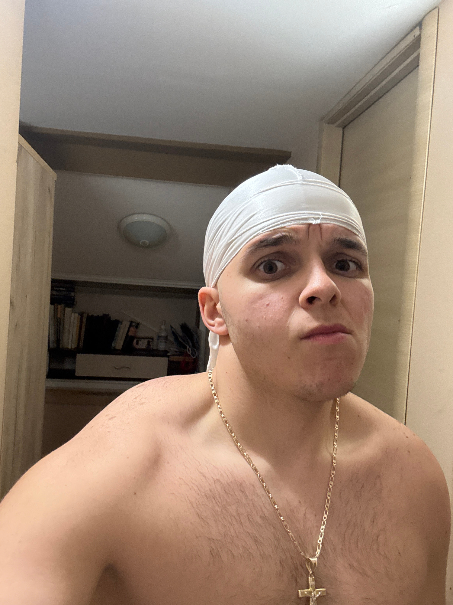 A fair-skinned person with a white head covering and a gold cross necklace is shown from a low, angled perspective. The person is partially undressed, with their shoulder exposed. The background revea…read more