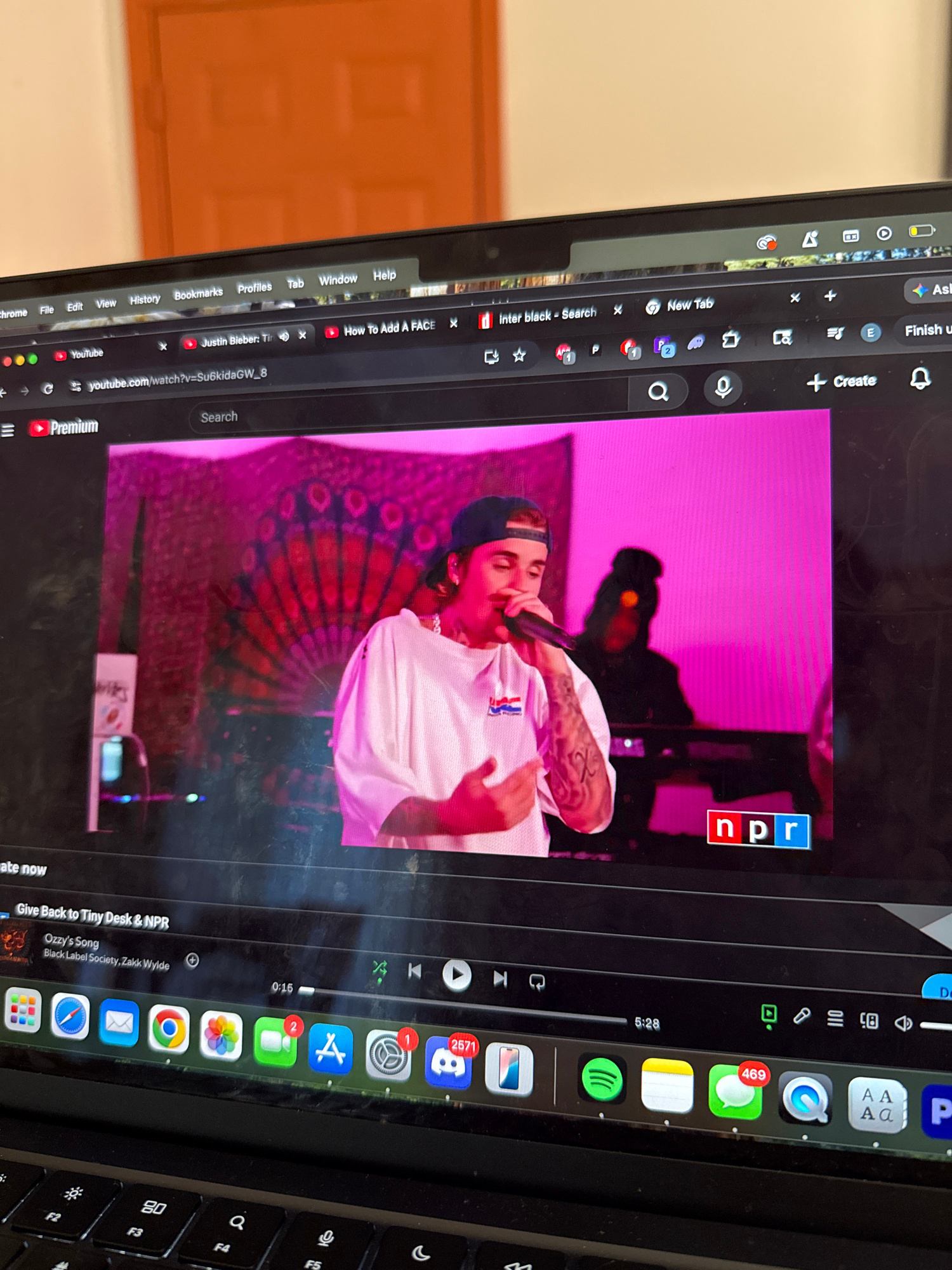 A laptop screen displays a YouTube video of a musical performance by Justin Bieber, featuring an NPR logo, set against a pink backdrop with a patterned design resembling a peacock feather fan. The per…read more