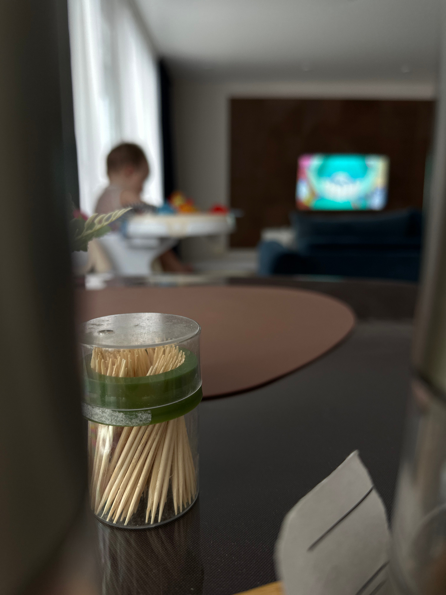 The image shows a container of toothpicks in the foreground, with a blurry background revealing a room interior. A television screen is visible on the wall, displaying colorful graphics. In the distan…read more