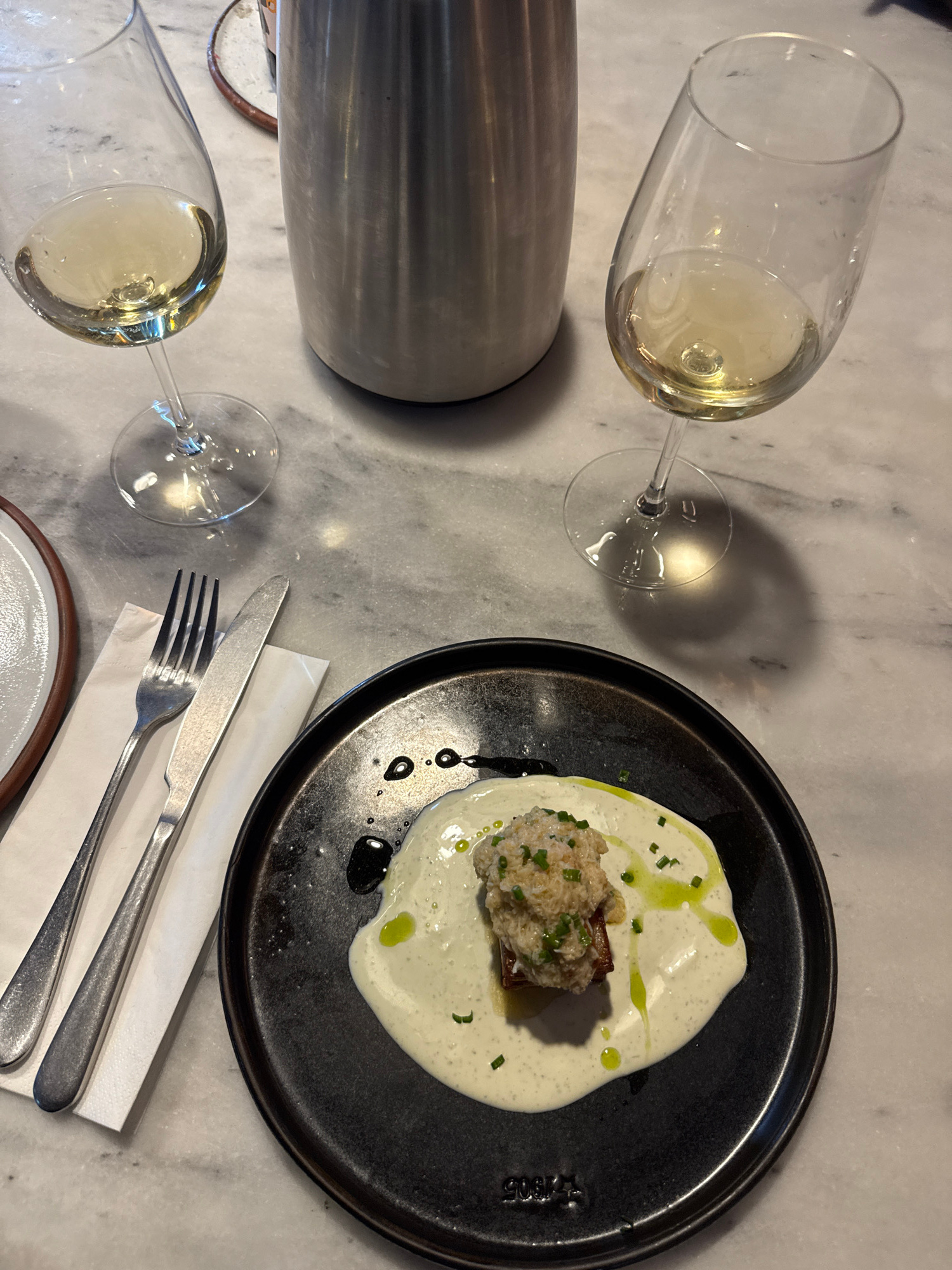 The image shows a table setting on a marble surface, likely in a restaurant. There are two wine glasses, each partially filled with white wine. Beside them is a cylindrical metal object, possibly an i…read more