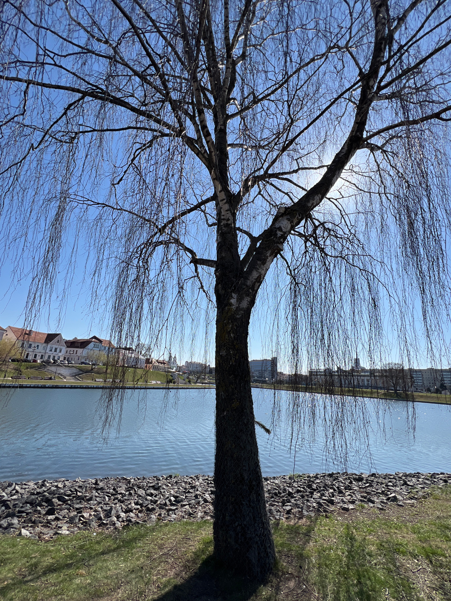 The image shows a tree, likely a birch based on the bark texture, with bare branches against a clear blue sky. The sun is visible through the branches, creating a bright spot. To the right of the tree…read more
