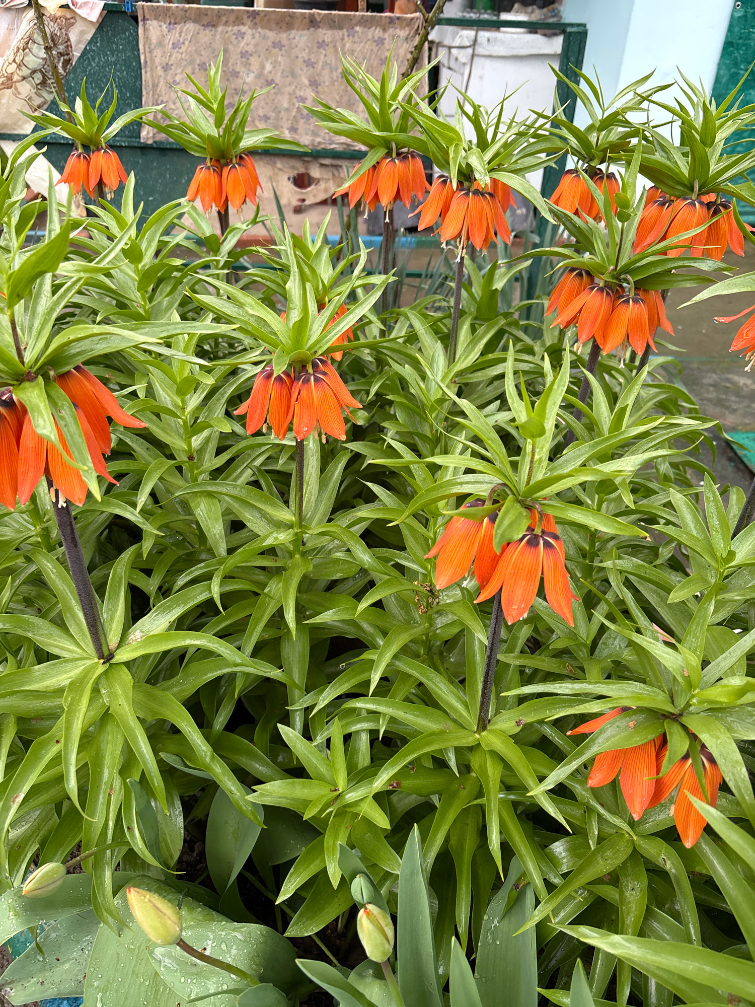 The image shows a patch of orange crown imperial flowers (Fritillaria imperialis) with their characteristic dark stems and surrounding green foliage. The flowers are arranged in clusters around the st…read more