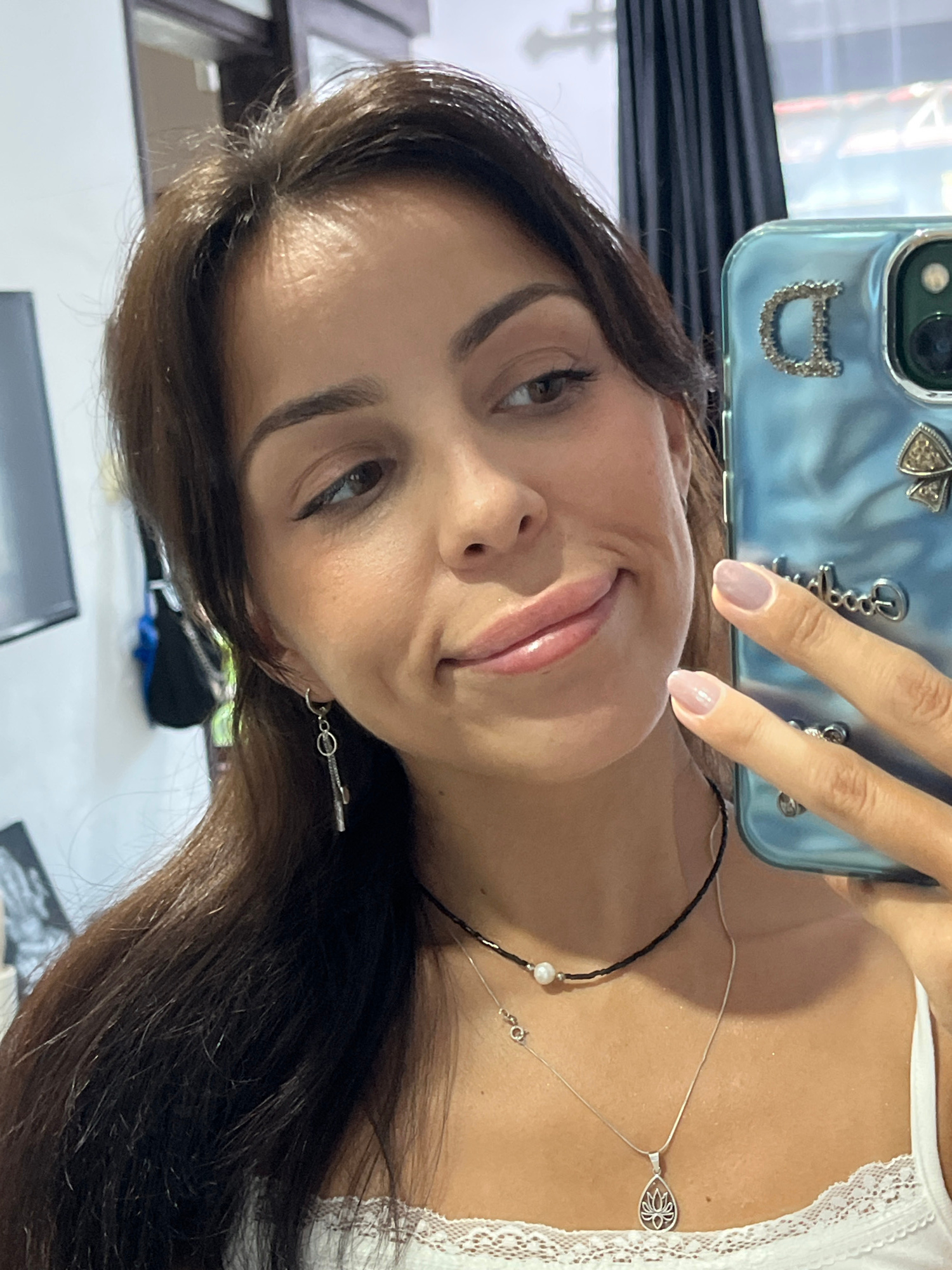 A woman is taking a selfie with her phone. The phone has a light blue case with rhinestone decorations. The woman is wearing a white top with lace trim and two necklaces, one a black choker and the ot…read more