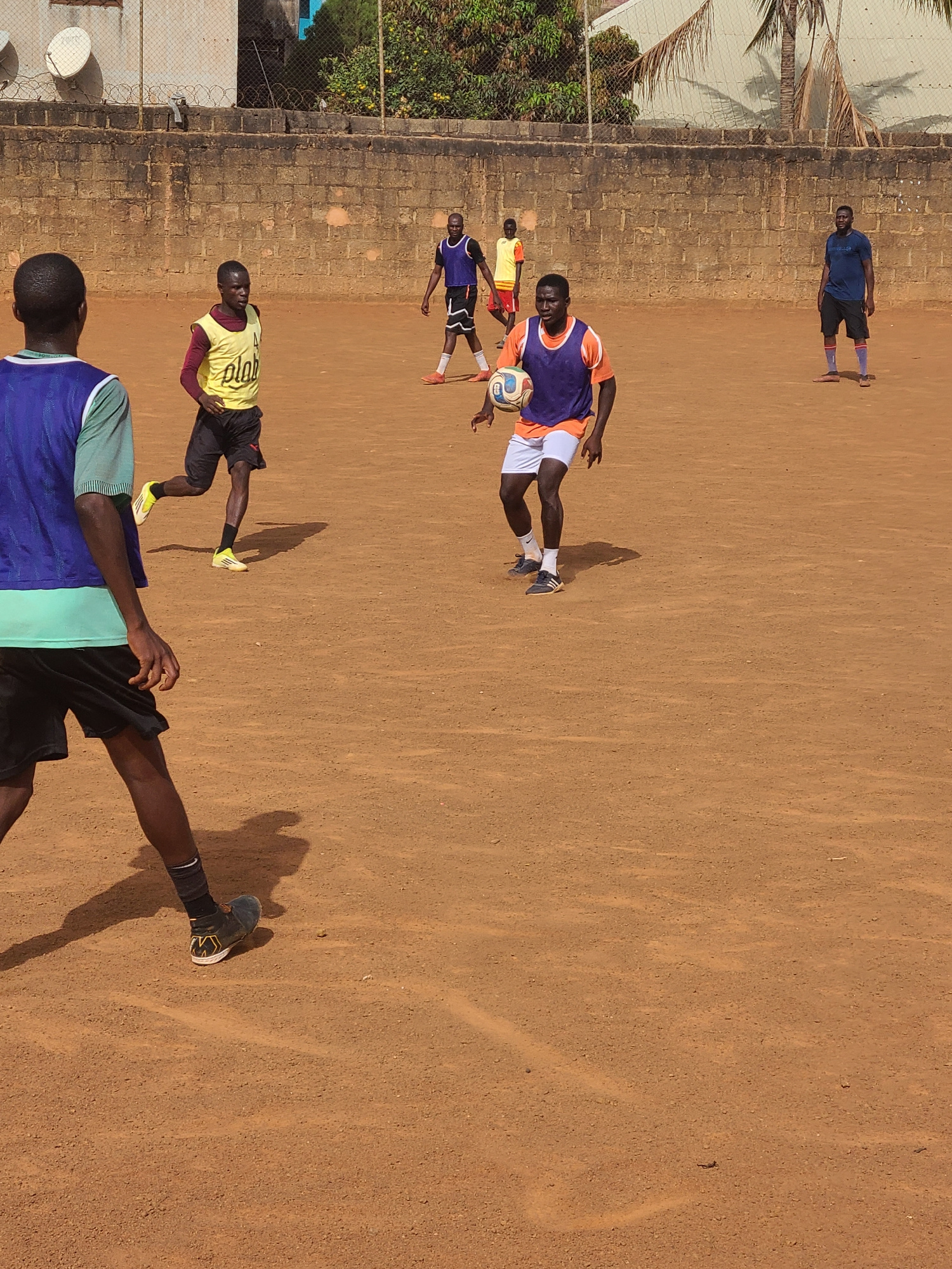 The image depicts a soccer game in progress. Five individuals are visible on a reddish-brown dirt field. One player, wearing an orange and purple jersey and white shorts, is controlling a soccer ball.…read more