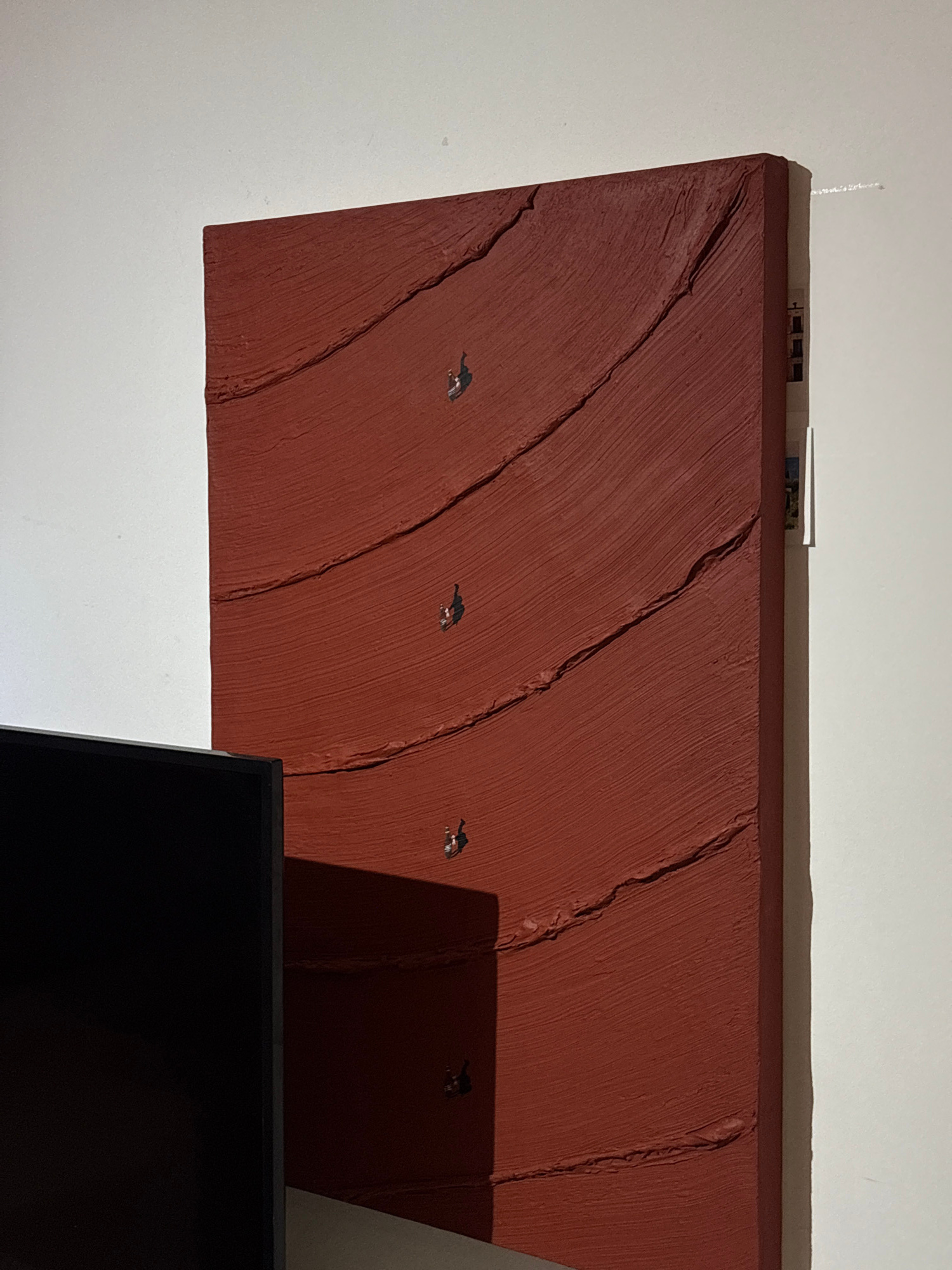 The image shows a portion of a wall in San Bernardino Tlaxcalancingo, Mexico. The wall is painted white, and a reddish-brown, textured art piece is mounted on it. The art piece has a roughly trapezoid…read more