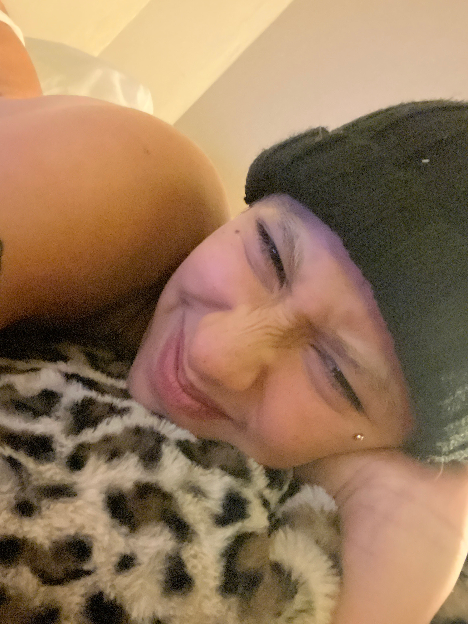 A close-up of a person wearing a black beanie with short hair, a helix piercing above the left eye, embracing a stuffed animal with a leopard print. The background appears to be a bedroom with a whiteβ¦read more