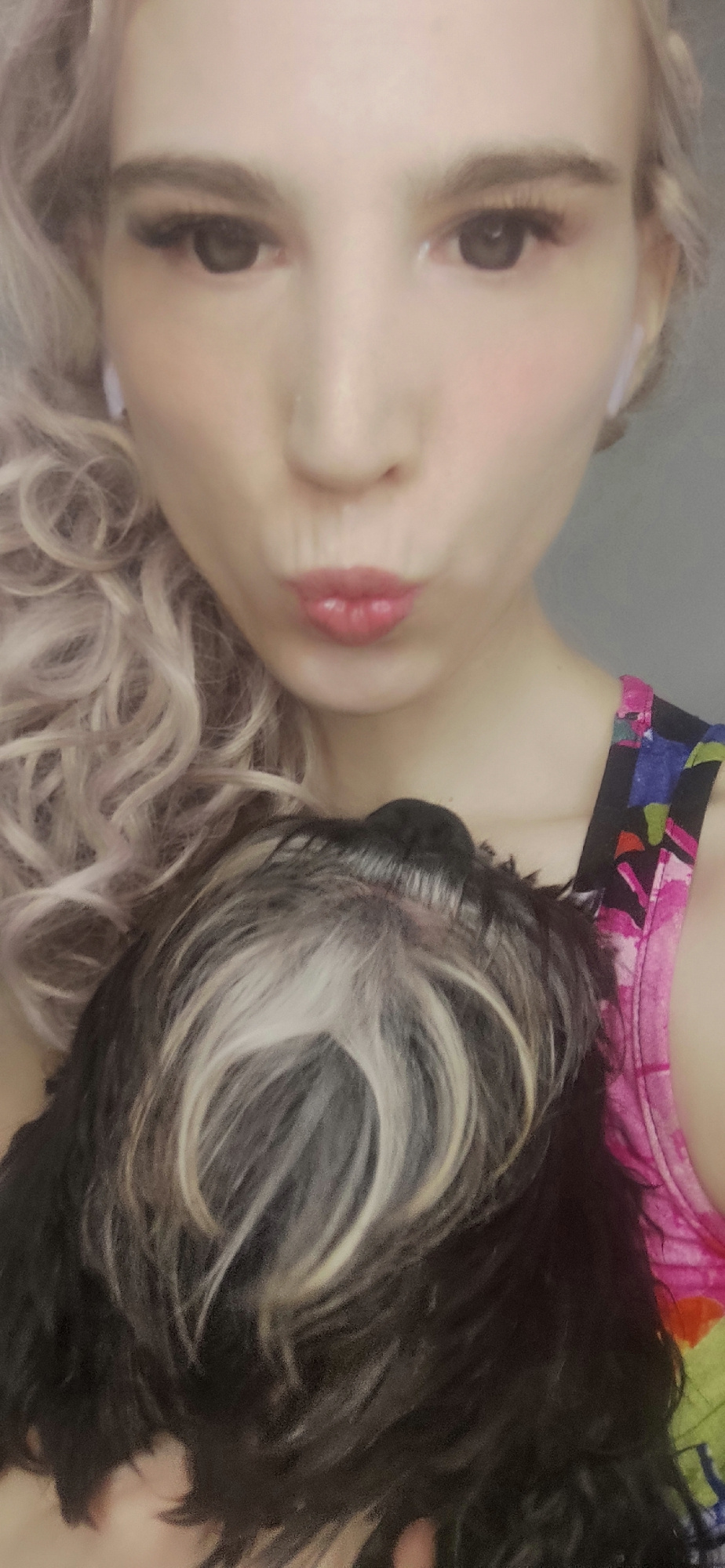 A woman with curly blonde hair is lying down next to a black and white Shih Tzu dog. The woman has fair skin, brown eyes, and pink lips. She is wearing a brightly colored floral shirt. The dog is lyin…read more