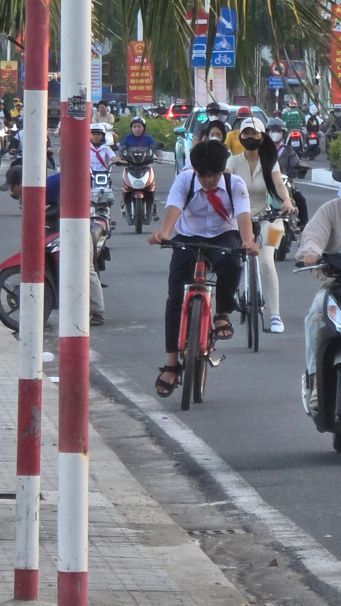 The image shows a street scene in Nha Trang, Vietnam. A boy wearing a white shirt, black pants, a red scarf, and sandals is riding a red bicycle. Several people on scooters and bicycles are traveling…read more